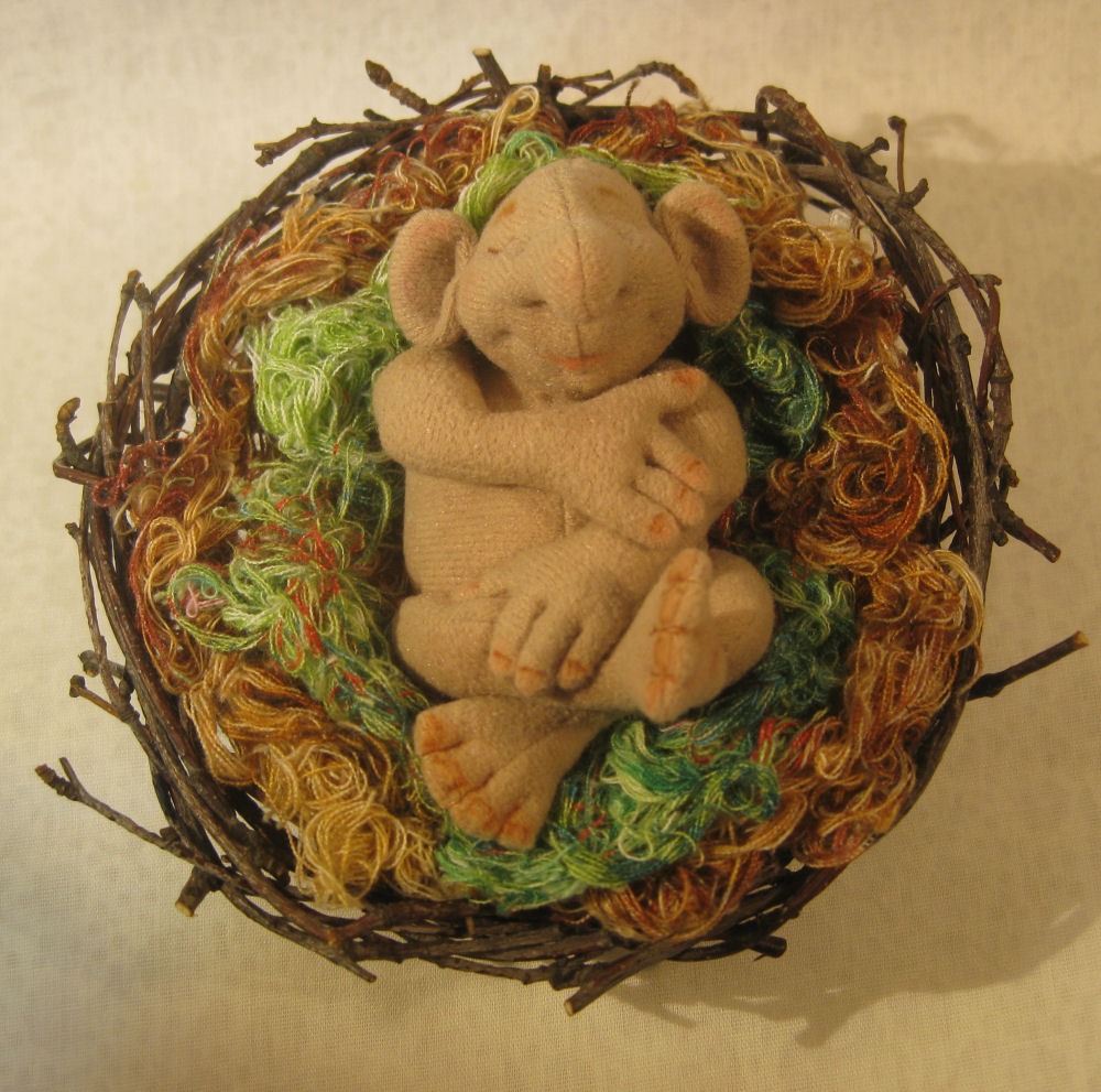 The bird's nest is woven from fresh-cut long twigs from Hanging Birch trees, into an irregular basket. The soft bedding is thread reclaimed from washing quilt cloth pieces.