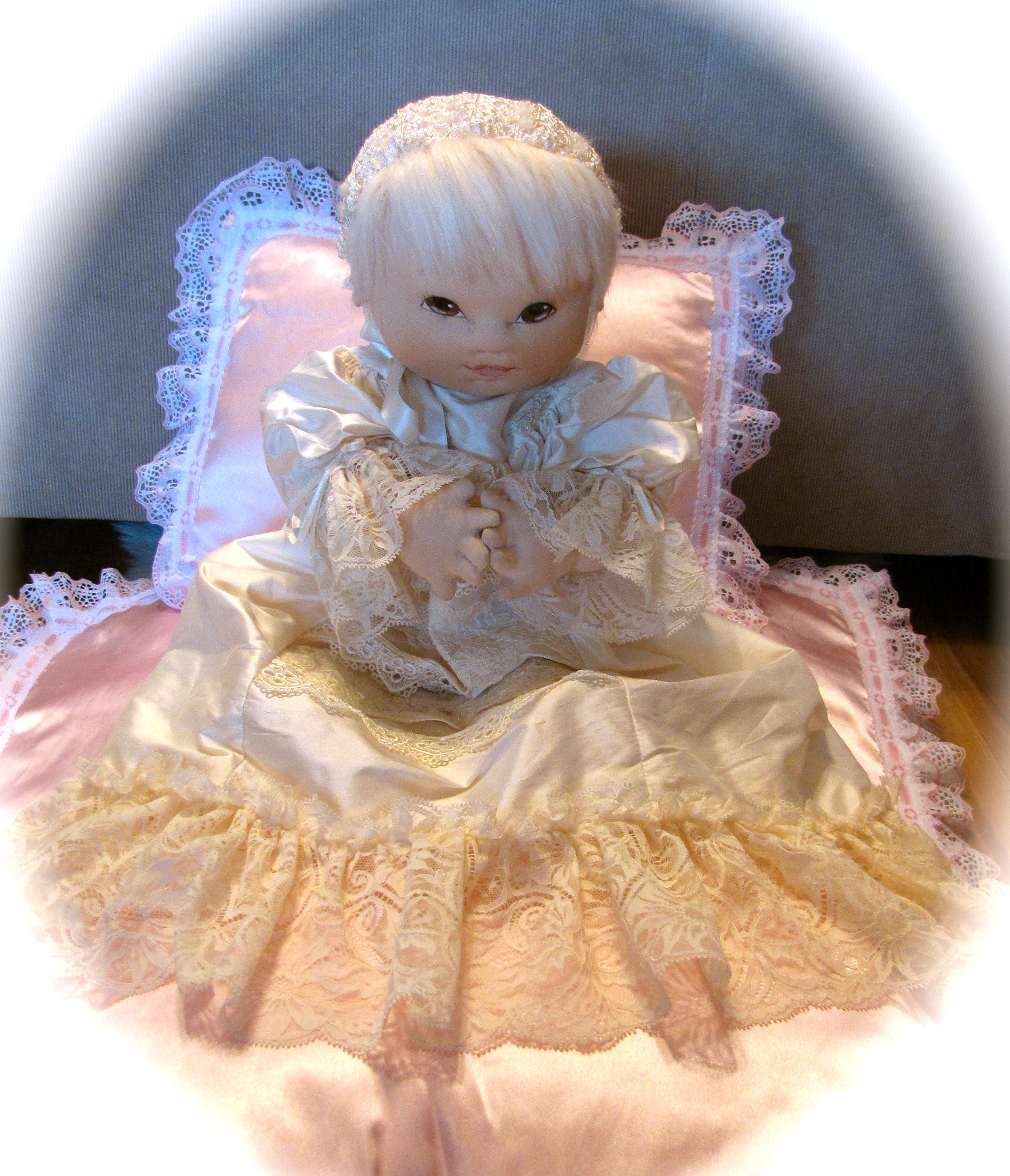 Blanchette is a soft sculpt baby doll created from the Bonnie pattern by Darlene Rausch. Her clothing is hand made by me. Her best friend Zeke the little wolf is also created by me.