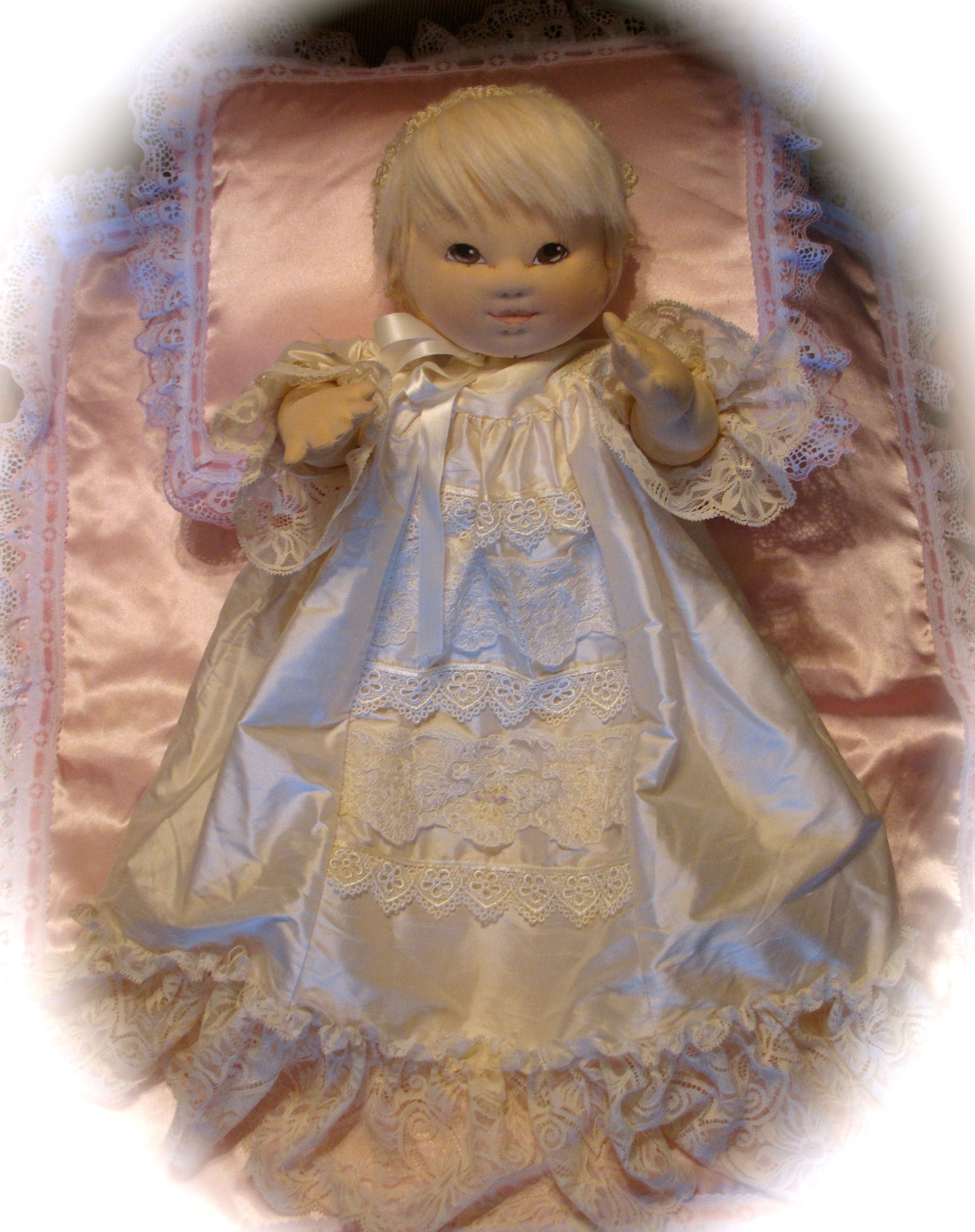 In her arms a mini Waldorf type doll made for her, wearing a tiny heirloom dress from a pattern by scientific seamstress.