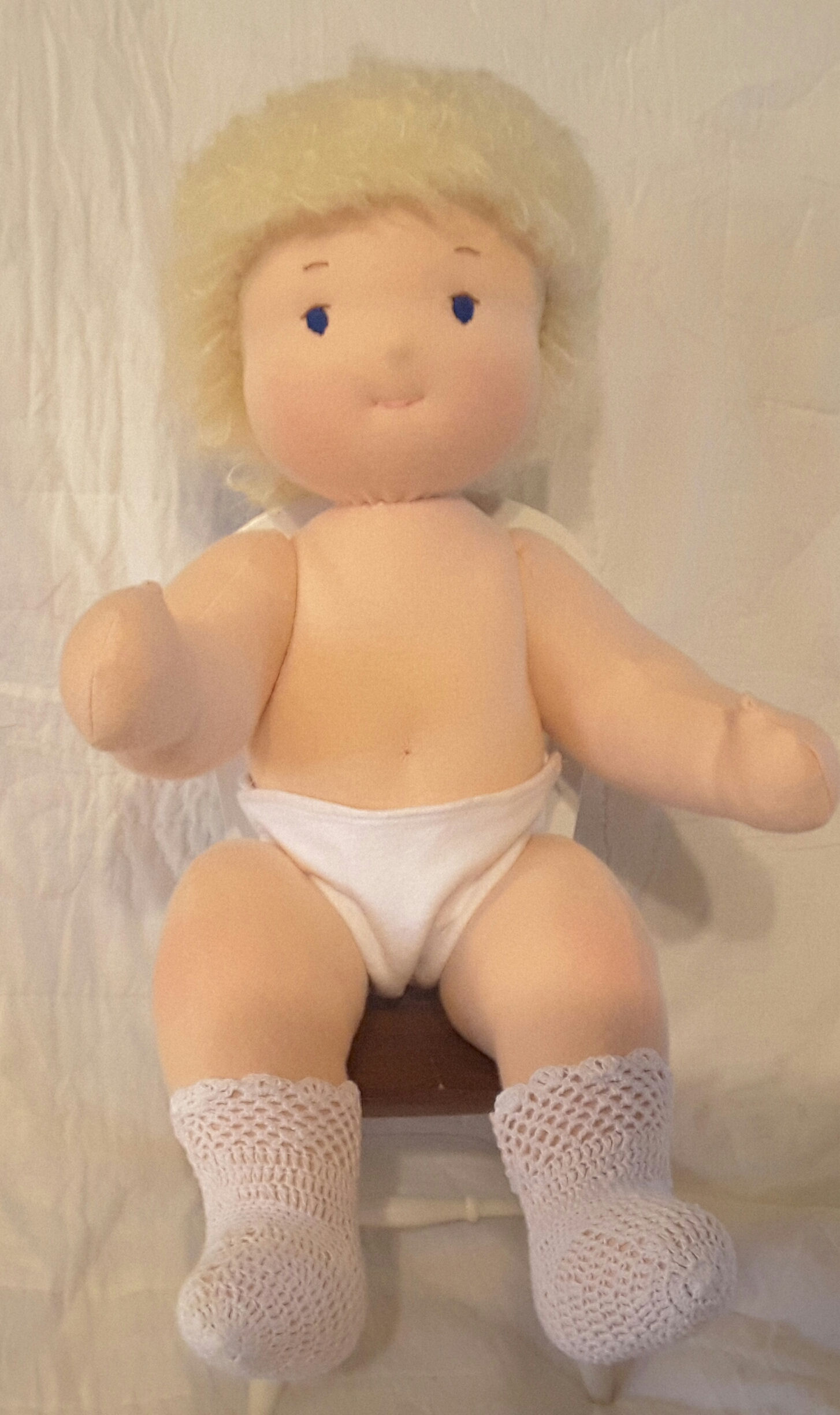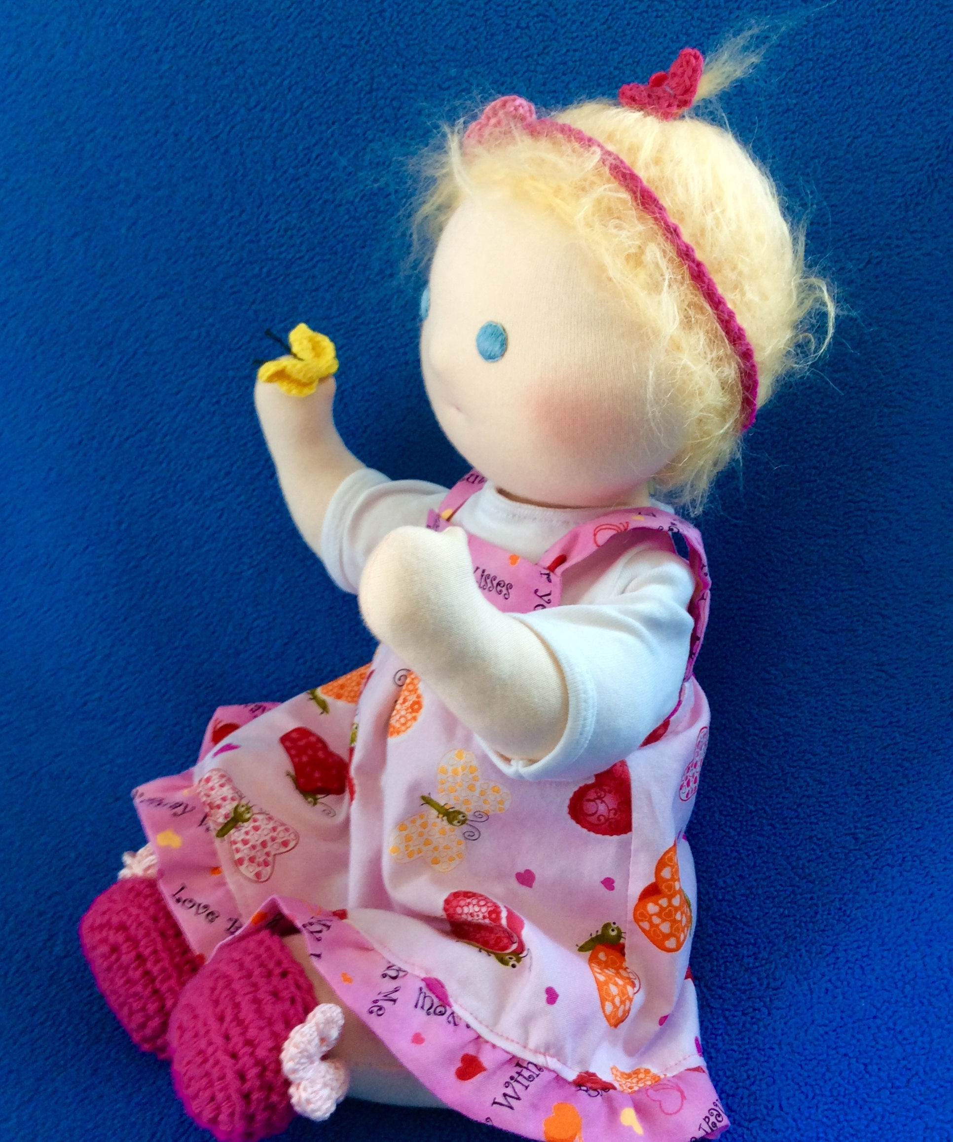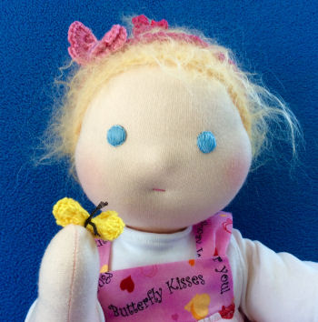 Vanessa's sweet spirit is as soft and gentle as a butterfly's kiss. Her Waldorf-inspired head, face and hair are my original design. Vanessa's face is needle felted wool, covered with 100% cotton knit. I embroidered her eyes and mouth, using 100% cotton floss and crocheted her honey-blonde hair using Wild Brushable Mohair yarn. Vanessa's body is a variation of Estelle Ansley Worrell's 15" Baby Doll, from Dolls, Puppedolls, and Teddy Bears, copyright, 1977.