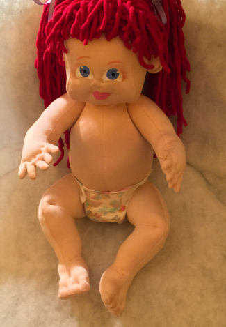 This is Annabel & she is 10 months old. I used flesh coloured stretch scuba fabric for Annabel's body & head. I used my old faithful Judi Ward pattern for a basic doll for the body but enlarged it. The head is of my own design.