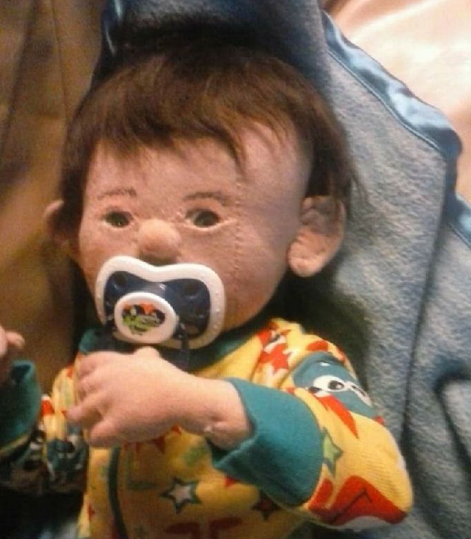 This my little preemie, his name is Gavin, he is only 14 inches long. He has a doe suede body that has been stuffed and weighted. He weights about 4 lbs, and he has flexible fingers, arms, and legs. He has inserted baby blue eyes, and a mouth made to take a Pacifier. His hair is a baby soft mohair wig to give him a more realistic look. He's wearing a preemie outfit. PS. He can even suck his thumb.