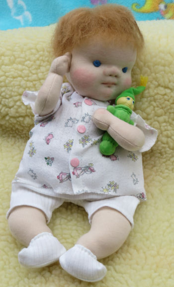 Lil-One's head is made in the classic Waldorf style using sheep's wool. The facial features (cheeks, nose, chin and lips) are needle felted and finally, the cotton knit 'skin' is pulled over the head. Her hair is a little rectangle of Icelandic sheep's wool trimmed to suit the face.