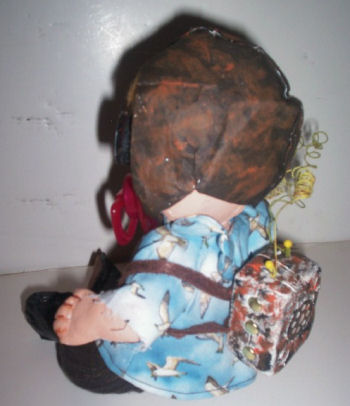My name is Avy. I'm a girl I think. I'm an adaptation from an original design by Susan Barmore ( AKA "Frowning Francis" ) I'm 8 inches tall, small for my age. I was tired of my pacifier so when mommy wasn't looking I got into her stash. Oh what fun... washer here, felt there, paint under there, some Tyvek there, and some here. Oh oh... Mommy caught me. But she's NOT mad. She sat me in a pose, took a picture. and used me for her Steampunk Baby model.