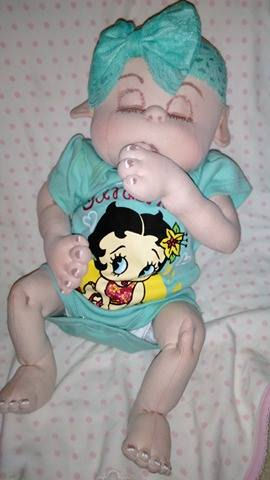 A preemie made from the Judi Ward's preemie baby pattern. She has jointed arms and legs. She loves cuddles and love, they will help her grow bigger and stronger. She is wearing a newborn onsie with sweet little betty Boop on it. She has no hair but she can still wear a big sweet bow to make her look as girly as she is. She is anatomically correct. She is so little, only 15 inches long. She still sleeps a lot to help her grow.