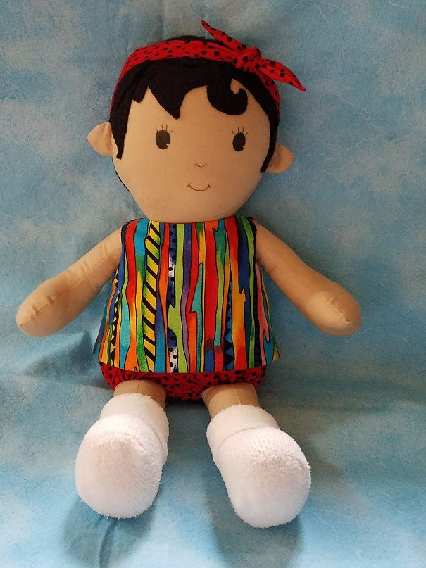 Her dress, hat, and panties are all of my original cloth doll clothing designs.
