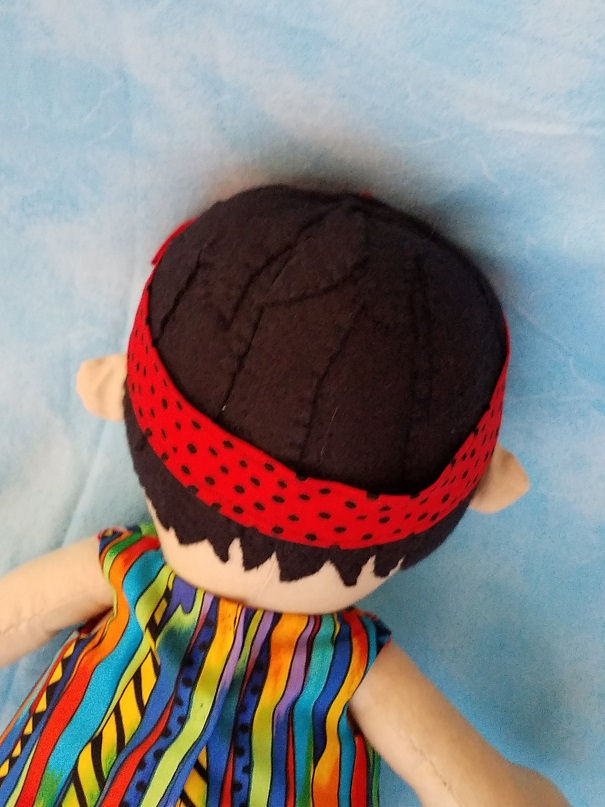 The doll is made from the Simplicity pattern 2809 but her hair is constructed from a square of partial wool felt. I sewed all the pieces down individually. I thought it would be safer than glue.