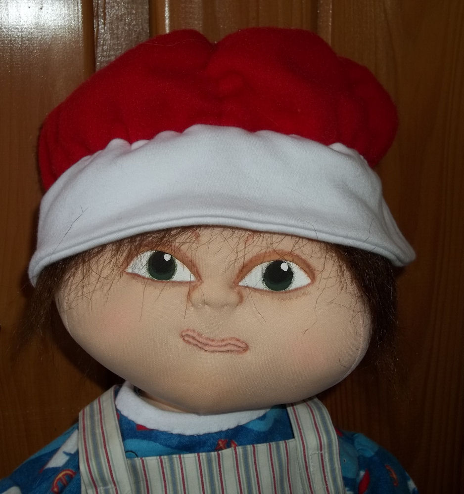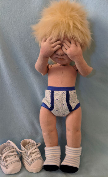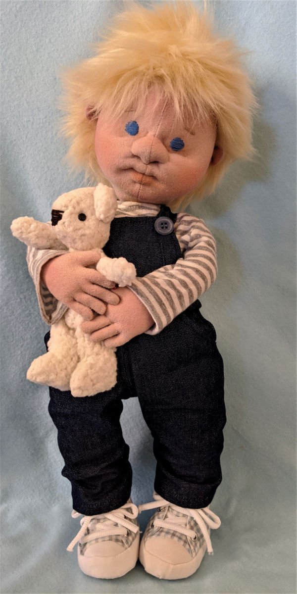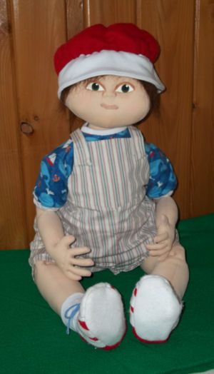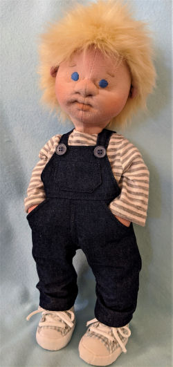 Toby is approx. 22" tall, made from an original pattern designed by me. He is made from Windsor Comfort fabric and is fully jointed and sculpted. Toby's facial features are done using a combination of chalk, colored pencils, and paint. The diaper, shirt, overalls, and hat that he is wearing are my own original cloth doll clothing designs, while the sneakers are from a Cobbler's Bench pattern.
