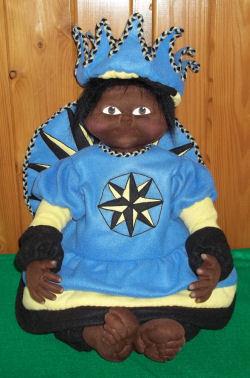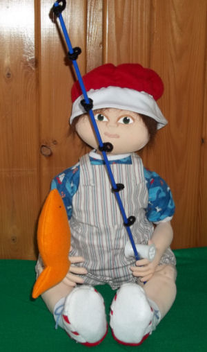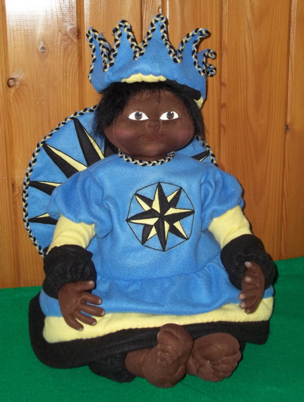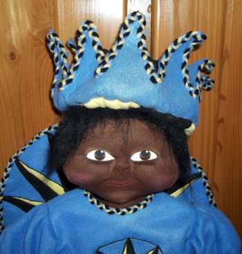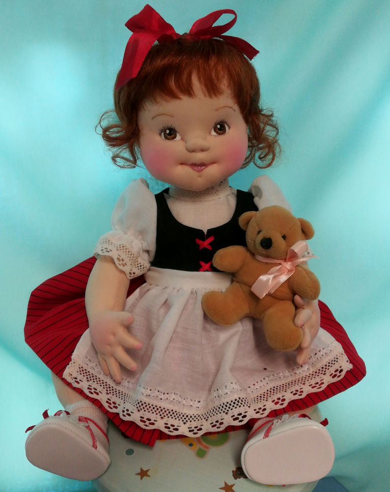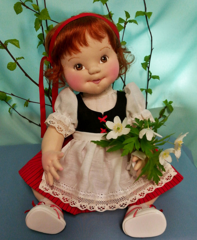 The Marja-Lena doll has plastic joints in her arms and legs. She can sit without support. Her facial features are painted with acrylic paints, her eyelashes and eyebrows are hand embroidered. Her shoes and toys are store bought.