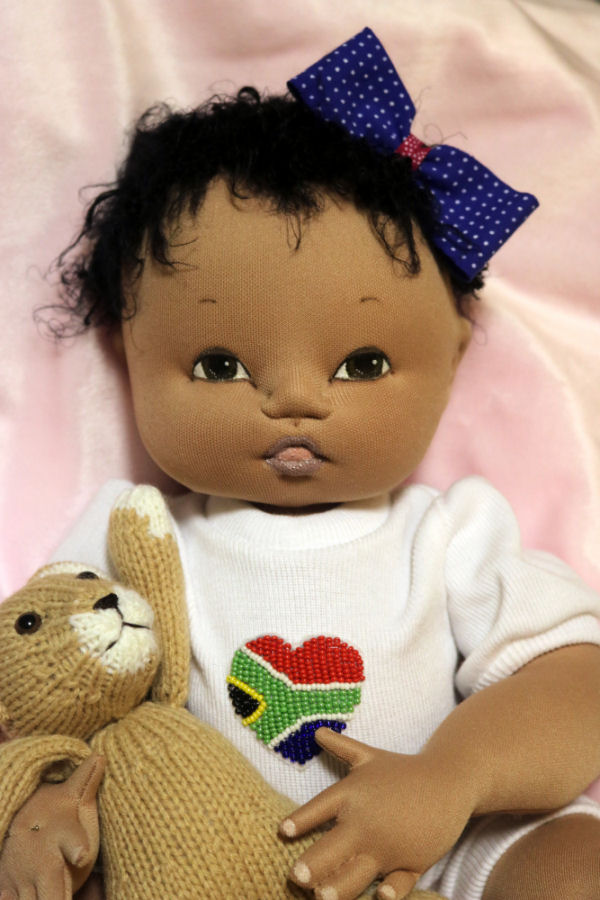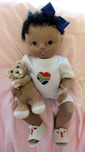 The lion cub is a symbol of our Big 5 of the animal kingdom. I have beaded the South African flag in a heart on her onesie. Her skirt and hair bow are made from traditional shweshwe fabric.