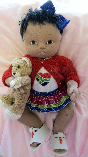 Baby Sinobuhle and her clothing are my own design and I have made the doll, her clothing, shoes and toy. Her hair is made from curled oven baked yarn stitched to her head. Her features are needle sculpted, eyes and mouth are hand painted and limbs are jointed.