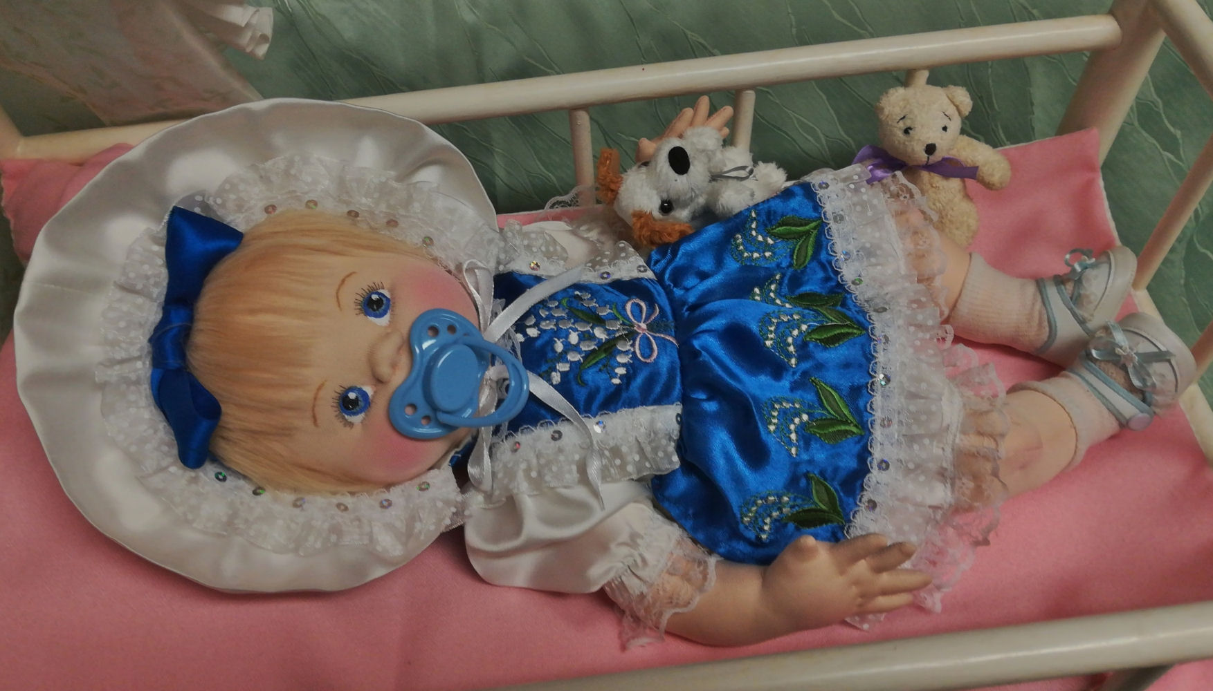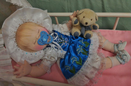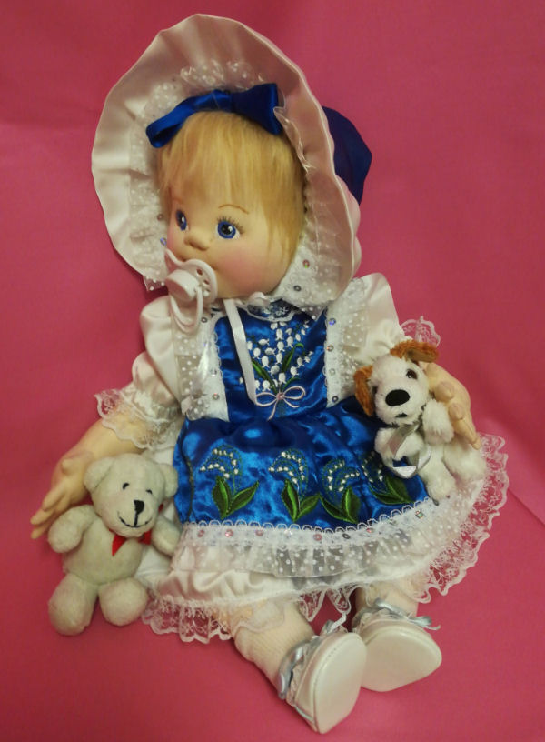 I have machine embroidered to her dress lilies of the valley, which are our national flowers. The legs and the arms of the Anna-Sofia doll are sewn into her body. She can sit with support. Her eyes and lips are painted with acrylic paints, the eyelashes and eyebrows are hand embroidered. Shoes and toys are store bought. She has also a magnetic pacifier.