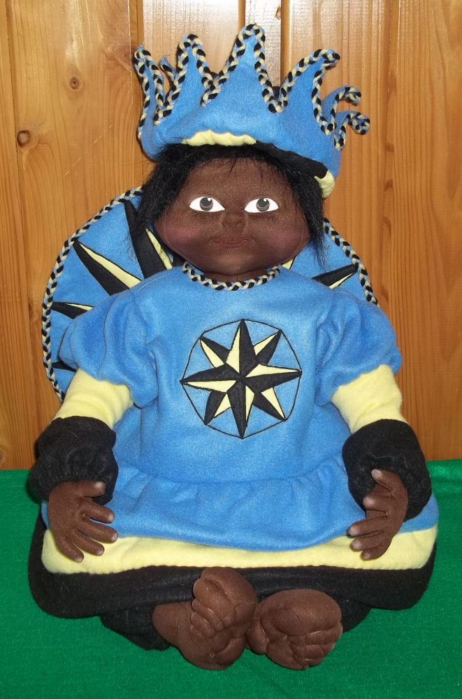 This is my baby doll Marja-Lena. She is about 17 inches tall and made by Darlene Rausch's pattern with some modifications. She is made from polyester knit and soft sculpted.