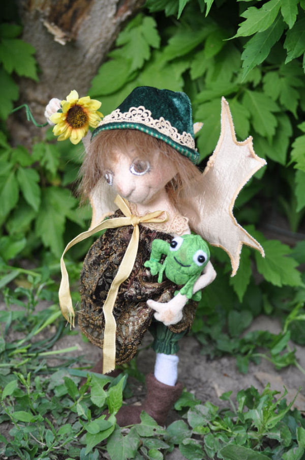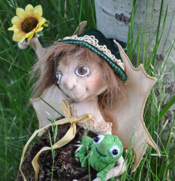 As arthritis continues to stiffen my fingers, I decided my days of making fairies and elves was over, until I spotted Jill Maas's beautiful fairy, Donatella, which is the pattern I used for this doll. She is self-standing, and each wired finger bends. Her frog friend and her clothes are all handmade.