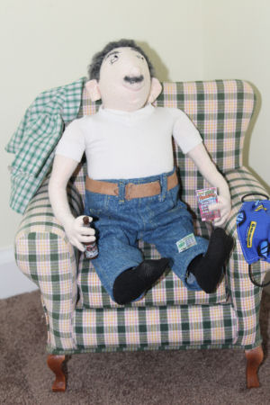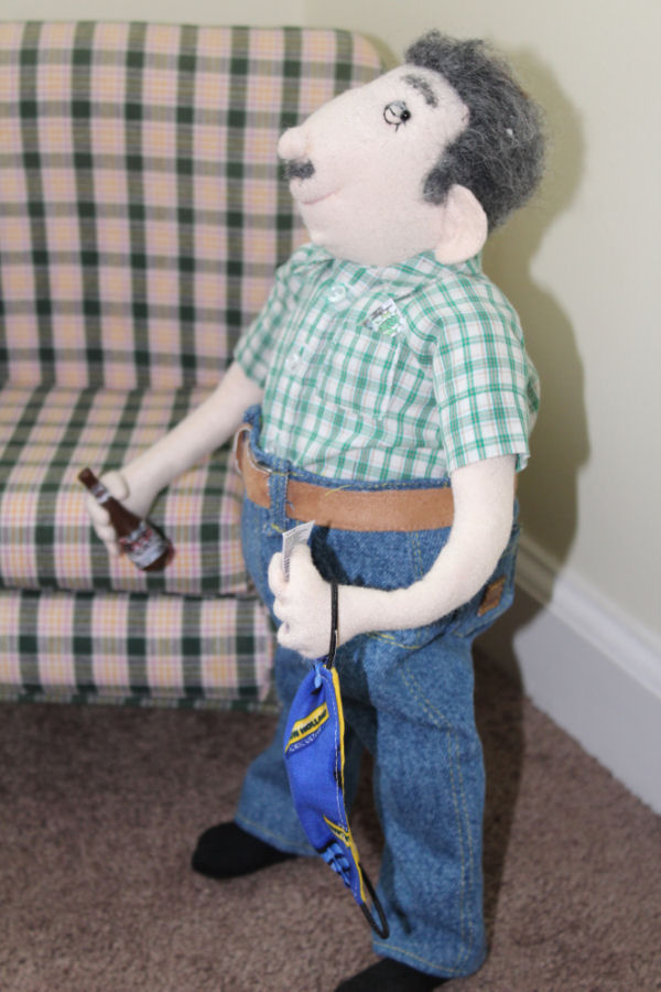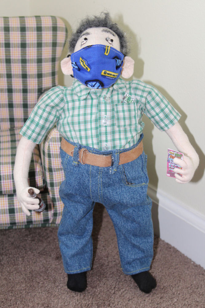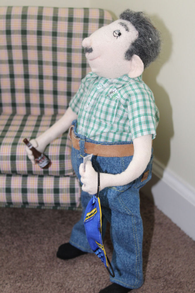 His clothing is all made from my husband's clothing and his mask is made from CNH fabric. He worked there for 41 plus years when he retired. After a long day he used to like to have a cold Coors light and sometimes scratch off a few lottery tickets. I made the bottle from quickwood and reduced the labels and added them to it and also made him some scratch off tickets. His chair was purchased.