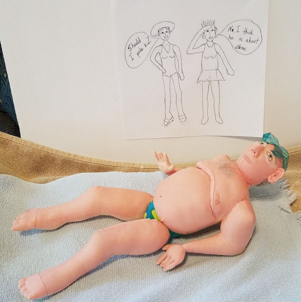 I made him from Jane Coughlan's Beach Bloke. He is reduced to 65% of the original sized pattern. The drawing in the background is mine. Drawing is not my forte.