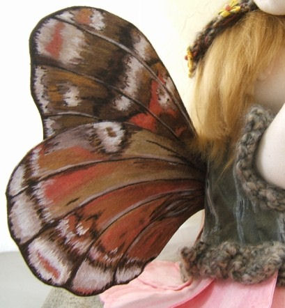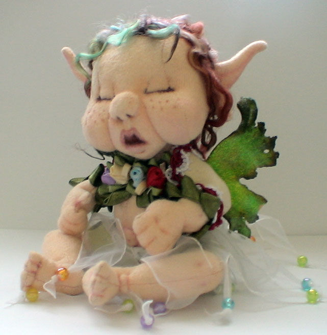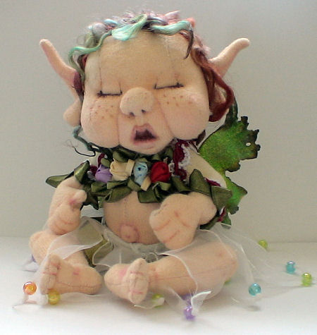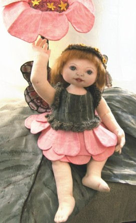 18" Body: muslin, fiberfill. Removable four-piece outfit of diaper, onesie, petal skirt, fairy wings: muslin; painted mixture of Mod Podge and acrylics. Crochet trimmed. Painted wings have Fun Foam core. I hand-wefted English Mohair and sewed it to doll head. Hairpiece: silk ribbon, yarn, wool felt, beads, embroidery floss. Freehand-drawn face: Prismacolor pencils, Micron pen. My original patterns.
