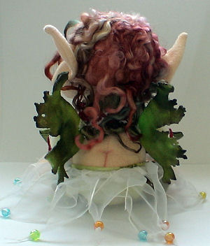 Flutter Fae is made from doe suede, needle sculpted and highlighted with water colour pencil. She has hand dyed mohair hair which has been needle felted into her head. Her wings are polymer clay and Flutter Fae sits at 5" to the top of her pretty wee head.