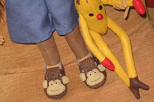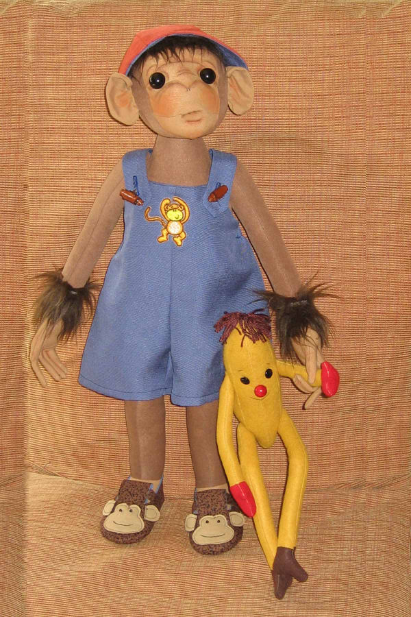 Mikey - made from Judi Ward's Molly Monkey pattern. I added Bruce Banana from the free download and designed my own short overalls. Monkey shoes are from a baby shoe pattern that fit him perfectly. He is made from doe suede, the darker color fuzzy side out and the lighter color, fuzzy side in. I added fur on his wrists and for hair. He also sports a wool felt baseball cap.
