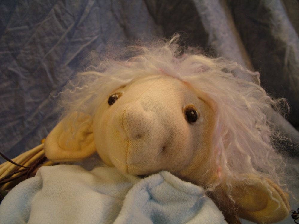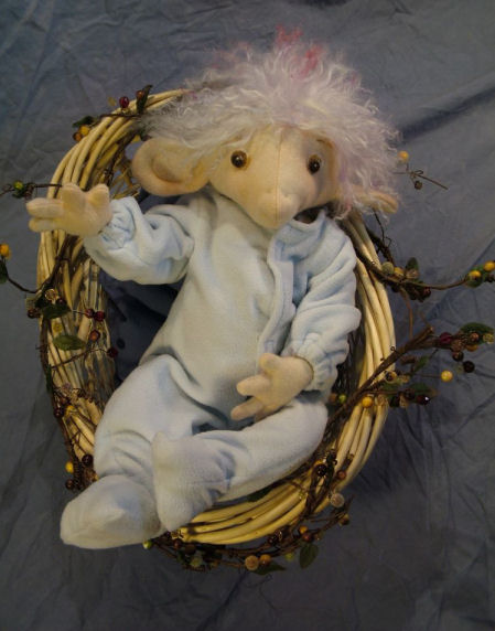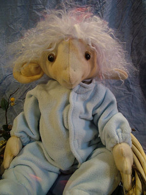 This faerie baby is known as a Whippersnapper, I know you've always wanted to know what one looked like, right? Her name is Lavender and she is 16" long and has a weighted body, legs and arms. She feels like a real little bundle of fey in your arms. Made from hand dyed wool fabric and hand dyed tibetan lamb locks for hair, with needle felted eyes, sculpted nose, mouth and toes. Dressed in a soft pair of fuzzy pj's, Lavender is ready for you to tuck her in. Prone to the giggles, this happy little faerie will always lift your spirits. Pattern for doll and pj's are my original designs.