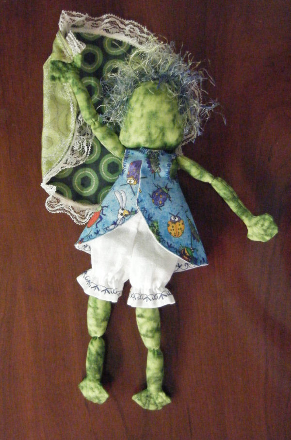 This is my own pattern. She is Princess Froggy and she lives at Emerald Pond, south of Dreamland. She is the daughter of Prince Charming III. This is her first play outfit and she is very excited about it.