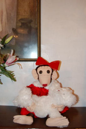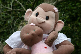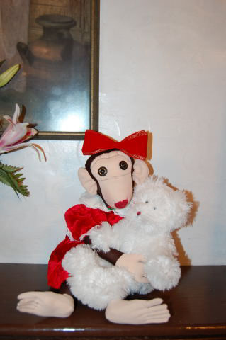 I renamed her Candy as she isn't the traditional monkey liking monkey food, she likes human food and is crazy about candy so that is why I gave her the name Candy. Please don't call her a monkey as she gets very insulted because she thinks she's human and she will chat with me in human language and with other household members monkey chatter. She named her little bear Honey and will not put her down anywhere and takes great care of her. She would make a great mother by the way she takes care of her little bear.