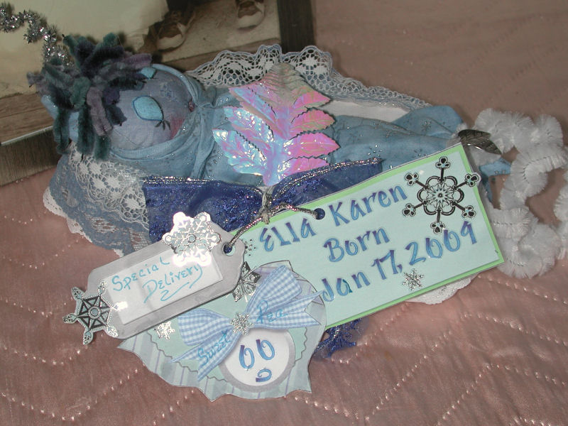 I went in search of a special Birth Announcement to commemorate her wintry arrival and found a Brenda Coulter pattern that asks "Do you know where baby fairies sleep?" In a pod of course. Now Sweet Pea, a. . Ella Karen dreams warm and secure in her pod, nestled in a basket of silk in front of her parent's Wedding picture.