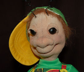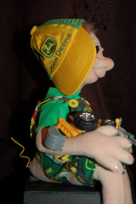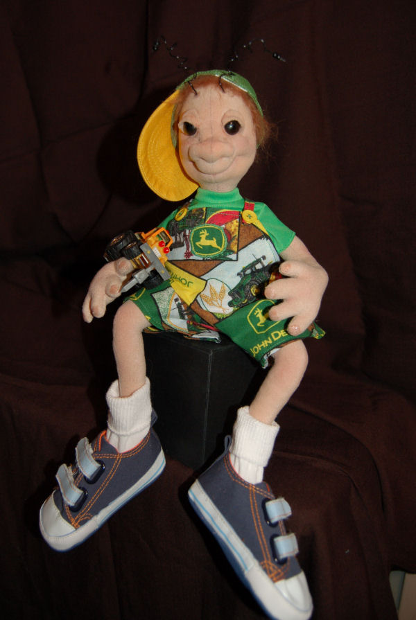 Johnny June Bug has a twin sister. He can't understand why his wings have not grown when her's has. Mother says don't worry boys grow a little slower, but he has his stinger. He loves tractors. You better watch when he turns one he's gonna ride your tractor. Johnny is dressed in handmade overalls. His hat is a Christmas ornament. He has on baby shoes and socks. His eyes are antique glass eyes and his hair is mohair. his skin is soft Bucksuede. He has a sweet personality.