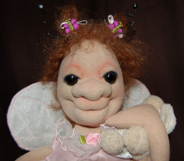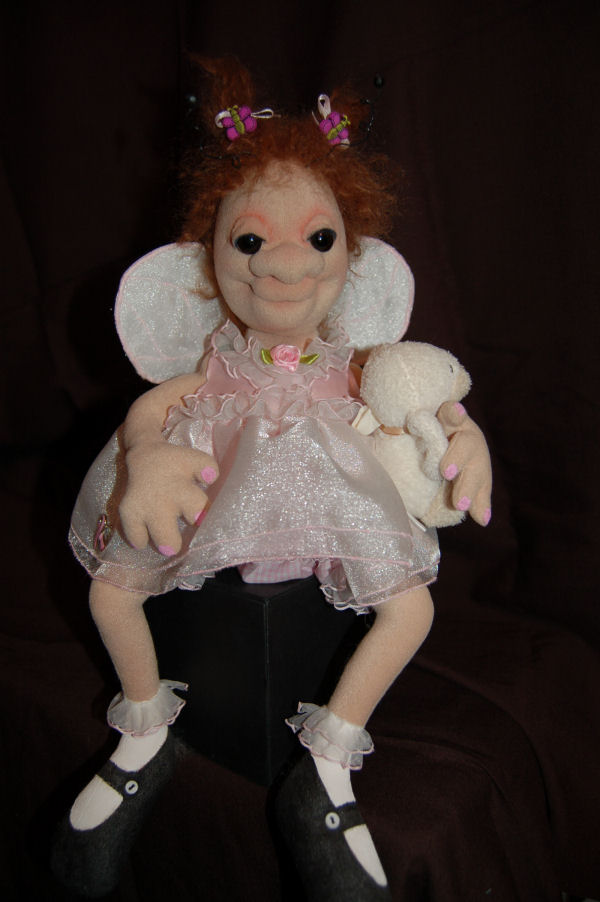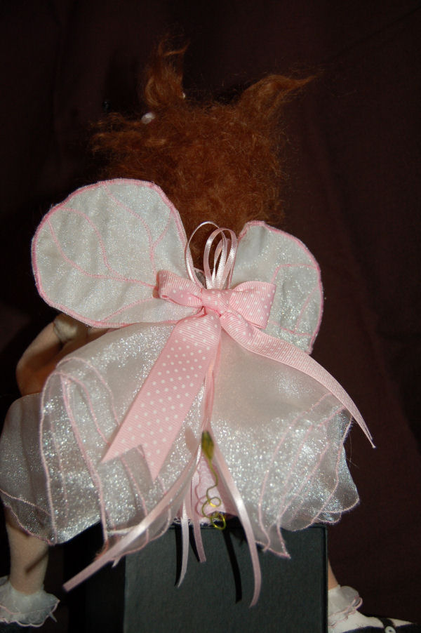Lillie June Bug is a baby girl waiting for her first birthday. Her mother tells her then her wings will be strong enough to fly. Her twin brother doesn't have his yet. Her dress is handmade with lots of lace. She carries a baby chick that was bought at the bug store. Her eyes are antique glass eyes from the late 50's. Her hair is mohair felted in and her skin is Bucksuede. Her socks and shoes are painted on trimmed in lace. She wears her mother's Breast Cancer pin.