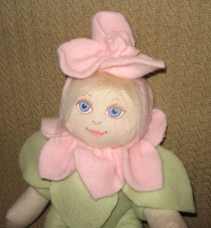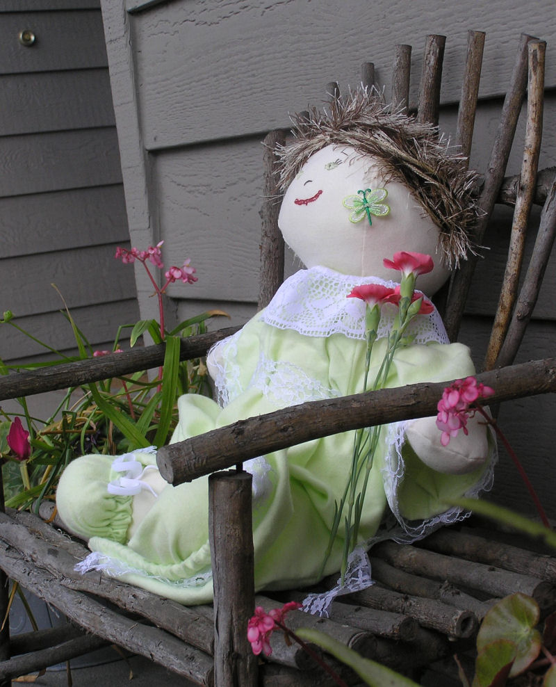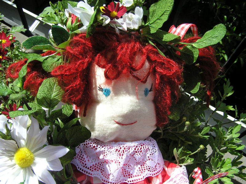 Since the ancient days in England there prevailed a custom of "bringing in the May" on May Day. English villagers woke at daybreak to roam the countryside gathering blossoming flowers and branches. Revellers, dressed in white with red or blue sashes, danced through the streets. Part of the celebration was the crowning of a May Queen. The Queen was chosen from the pretty girls of the village to reign over the festivities. Children celebrated by moving back and forth around the maypole with streamers. Belle is a Waldorf doll. Pattern is from the "Doing without" blog by Amberskyfire.