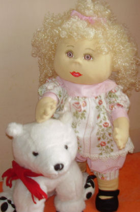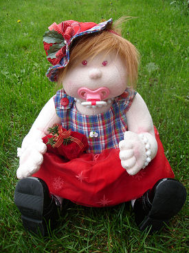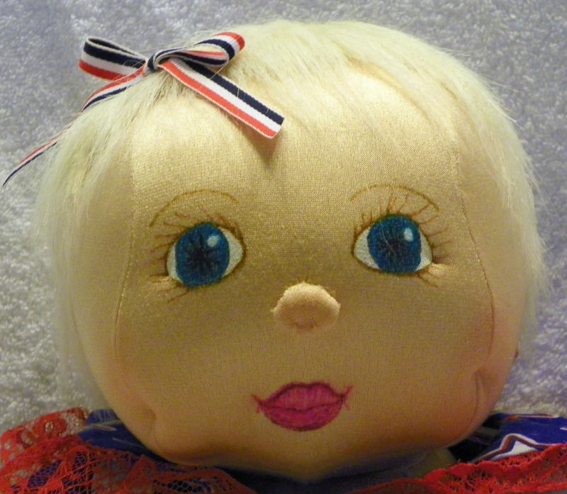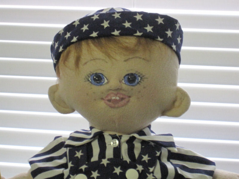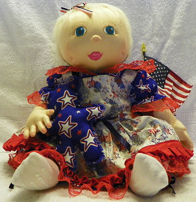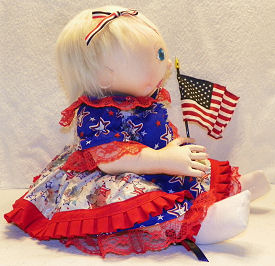 Independence, was born on the 4th of July, so we decided to celebrate this great holiday. Independence was made out of craft velour from a Judi Ward's 6-9 month size baby which includes a swivel head and button jointed arms and legs. She sits very well and looks so real when she is laying down. I used gel pens to get her expression on her face. Independence's outfit was made from an infant Simplicity pattern consisting of dress, pinafore and boomers. She loves celebrating this great holiday by waving the American flag and playing with her patriotic teddy bear, Liberty.