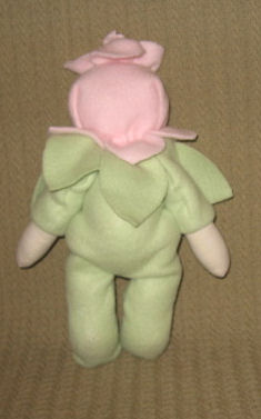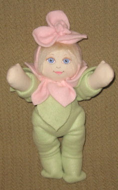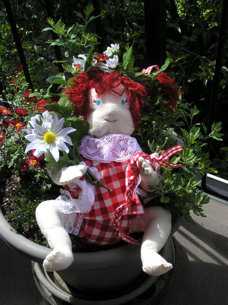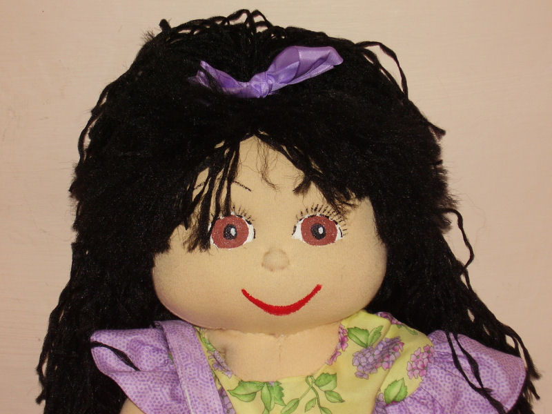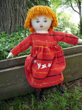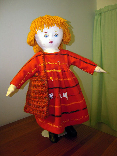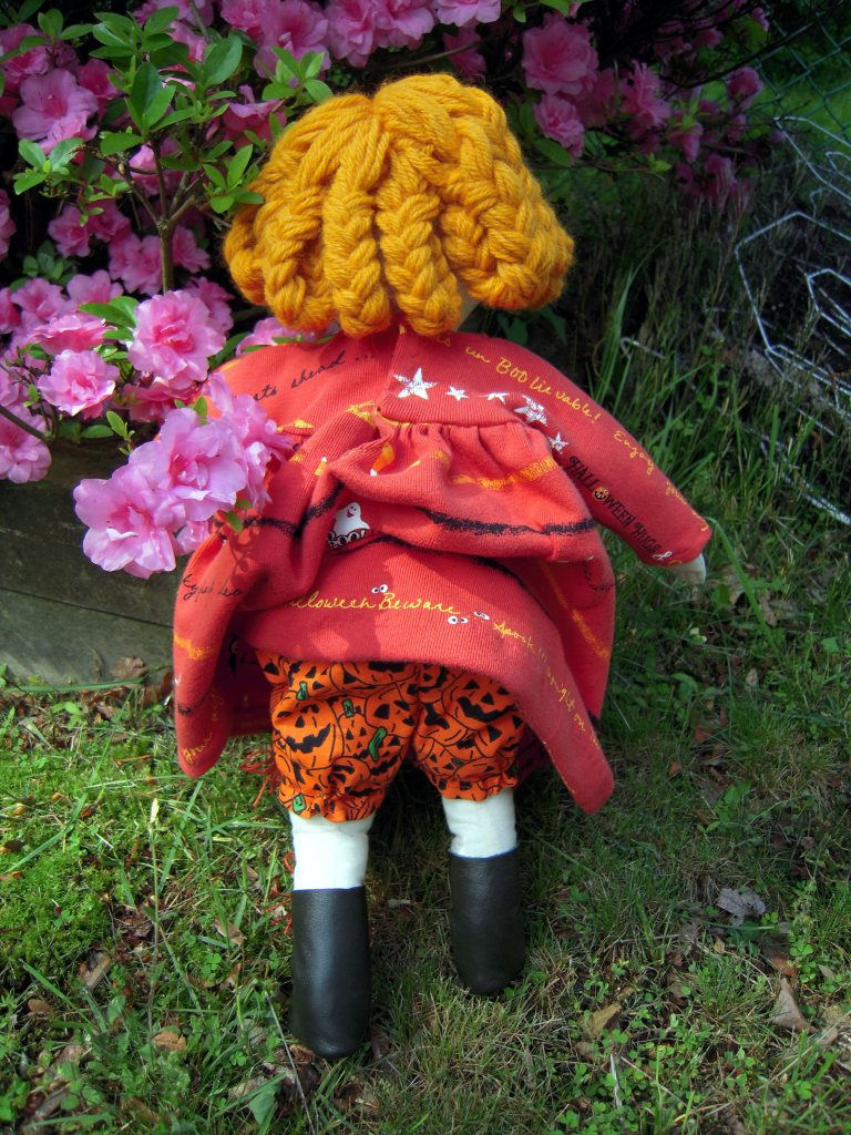 I altered the basic doll by redoing the head because it had printed on face features and hair. I prefer to embroider the facial features and make yarn hair. For the clothing, I decided on a Halloween theme. The dress is made from recycling one of my t-shirts. The knickers are made from the novelty boxer shorts my hubby never wore. The boots are from a soft, dark green leather that started out as a pair of ladies leather pants. Becky stands 16 3/4 inches tall.