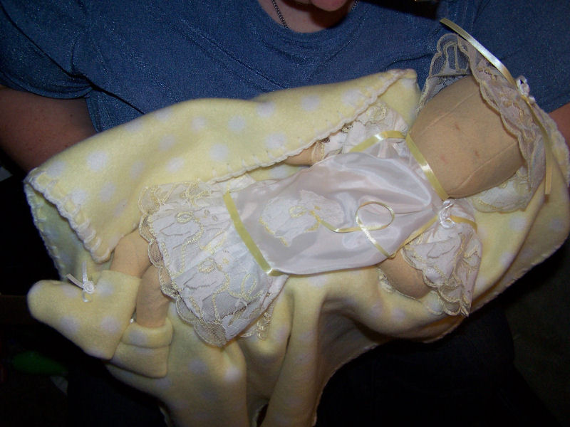 Emily was designed from Judy Ward's Preemie pattern and is a 30 week preemie. She has a weighted head and body, loose joints, and weak neck giving her the flexibility and feel of a real baby. Emily was created as a model for preemie clothes and her face was drawn on in colored pencil.