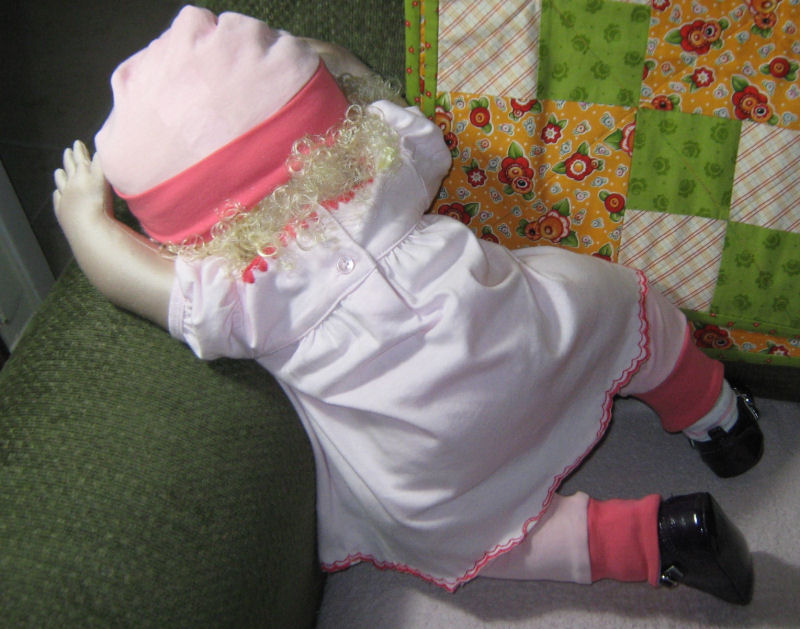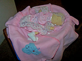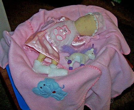 Emily's outfits are hand-made but the pink blanket and pink mittens are store-bought.