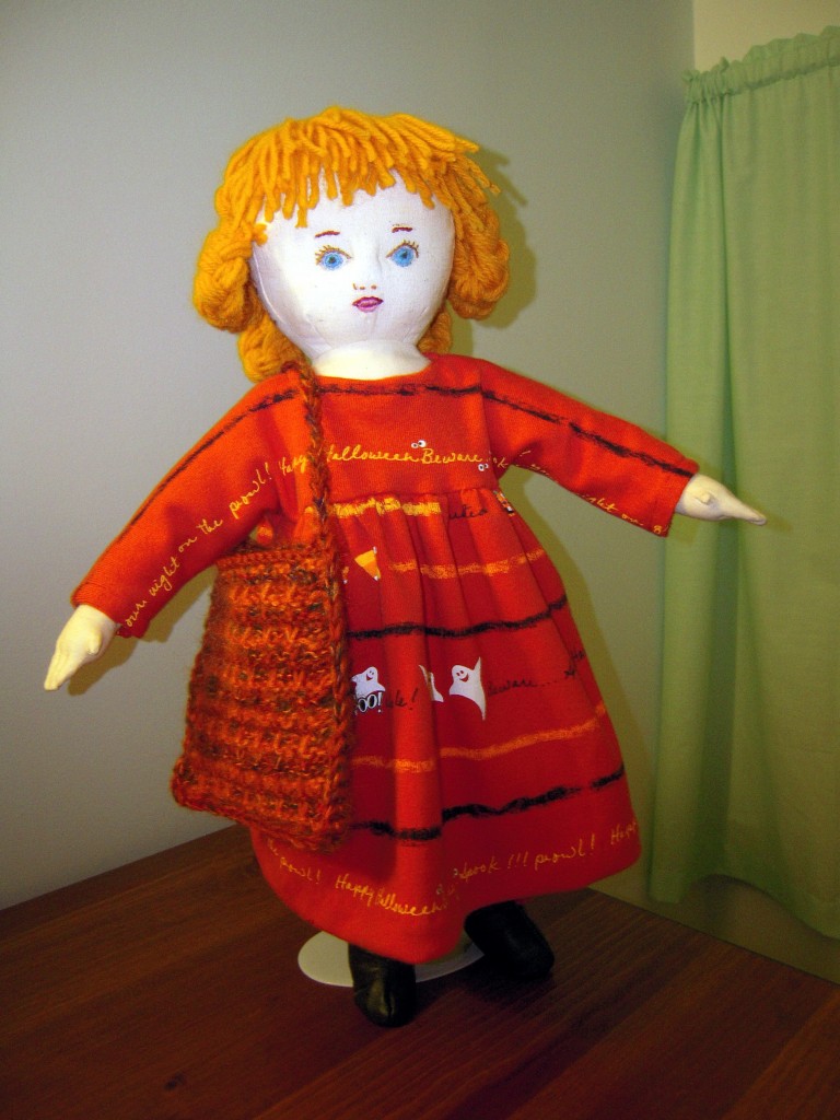Hi this Martha, a Gypsy Kid, pattern by Sally Lampi. Martha refused to wear her wig and insisted on her pumpkin bracelet.