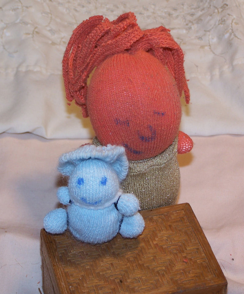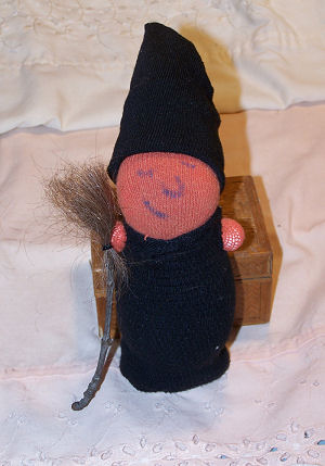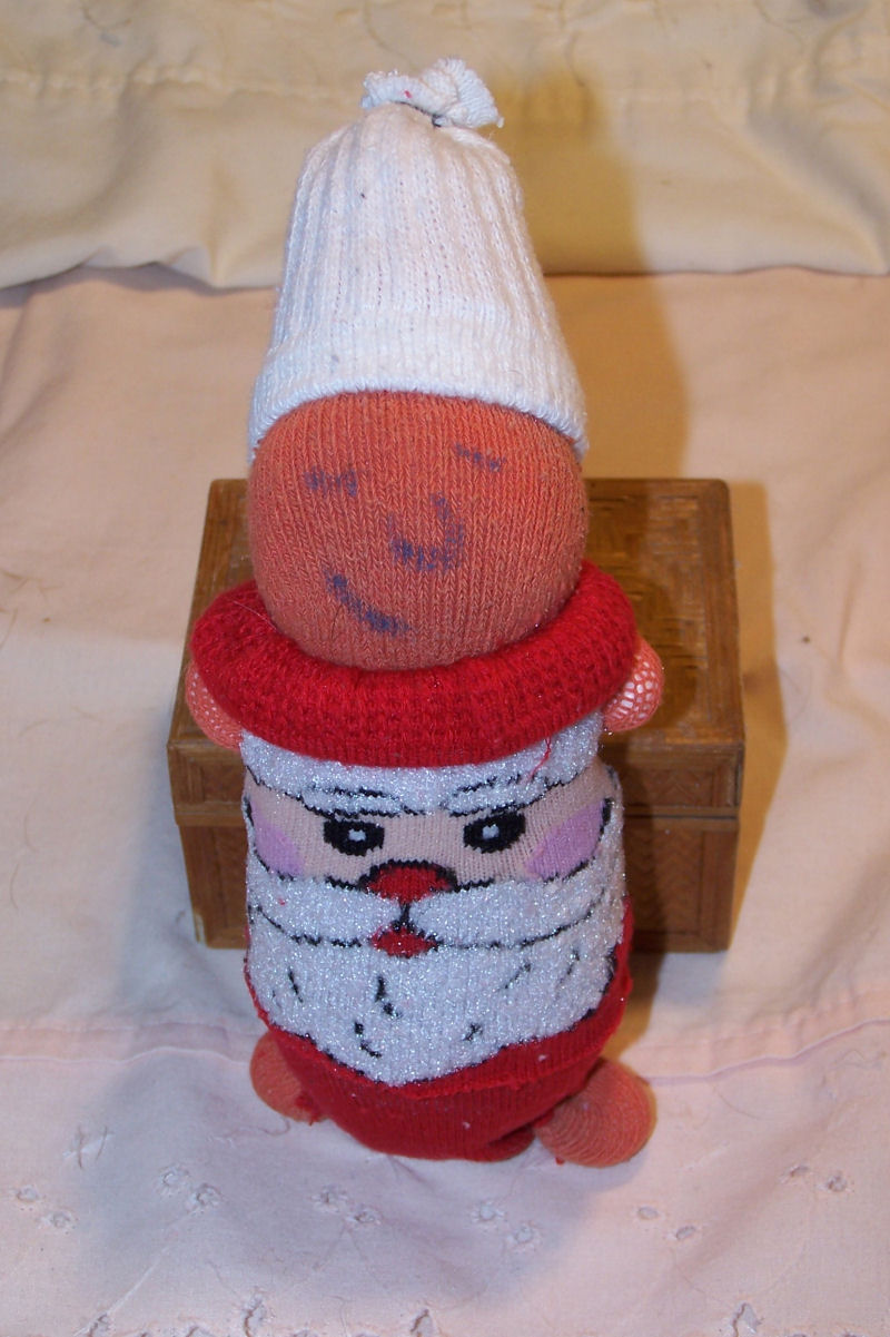 This baby's name is Jordan. She is my four year old daughter's first attempt at doll making. She is a no sew doll made from socks and rubber bands. I learned this pattern as a child. I made the outfits for her. Jordan is shown here in her holiday outfits. The witch outfit is made from mismatched black socks. The Christmas outfit is from a red Christmas sock and a white sock. The New Years party dress is from a gold Christmas sock. The tiny sock baby I made from a baby sock. The faces are drawn on in marker.