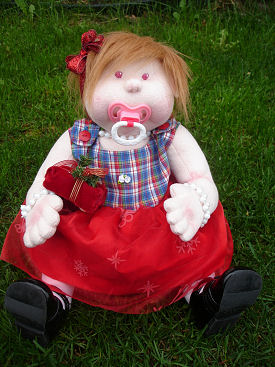Me...am Baby Princy. Am made of craft velour. Mommy made my face from a Dinky baby pattern while the rest of me are her own design. Even my hat, dress and the little gift. They all fit so perfectly..like its made just for me. Ain't I cute? Am 15" tall. I sit well and if you teach me to stand up, I CAN. I have a christmas gift for Adrian. Am going to his house now for the party. Bub bye