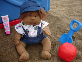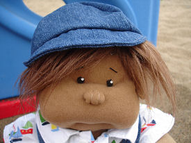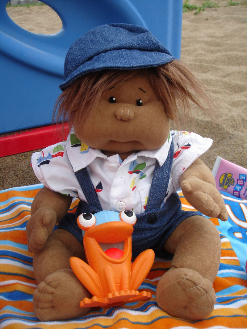 Yo..friends call me cash. Summer Holidays...beach is the place to be. Warm sun, lot of sand and lot of babes..I mean babies. I like it here. Am made from Dinky baby pattern. All my clothes and hat are custom made by mom. My skin is made of deer suede. Like my sun tanned skin....come join me at the beach.