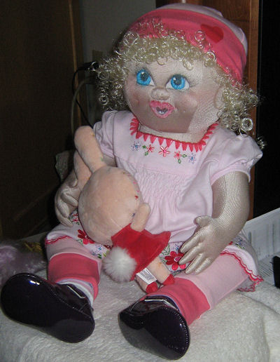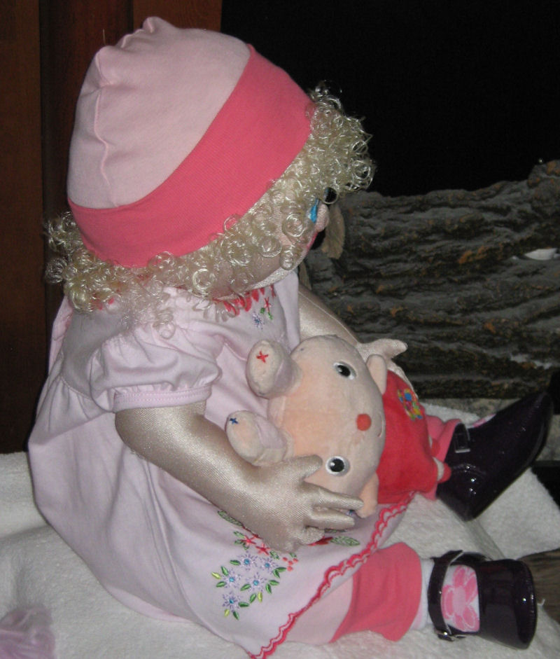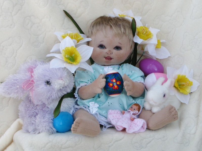 This is baby, Kelly's first Easter, so she is holding a little Easter bunny. The dress and bunny belonged to my granddaughter for her first Easter. This is my first attempt at face painting on a baby doll.