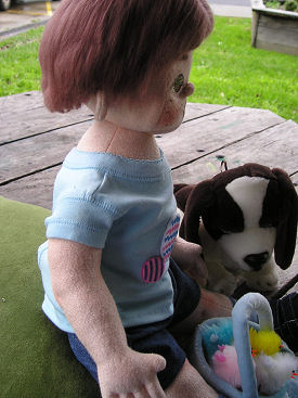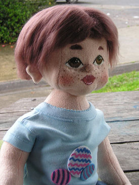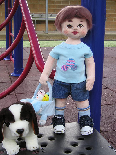 Aaron is my sixth doll, so I'm still a beginner doll maker. I combined techniques from Judi Ward patterns with needle sculpting techniques learnt from Kazi Mathews' patterns. Aaron has needle-felted hair, a sculpted and painted face, belly button, bottom, knees and elbows. His dog was purchased while his shirt, socks and shoes are made from old baby clothes. His shorts are made out of fabric from my favourite pair of worn out jeans and are my own pattern.