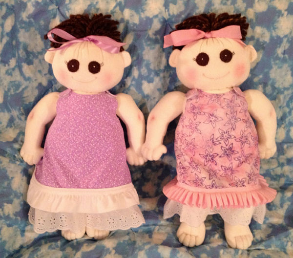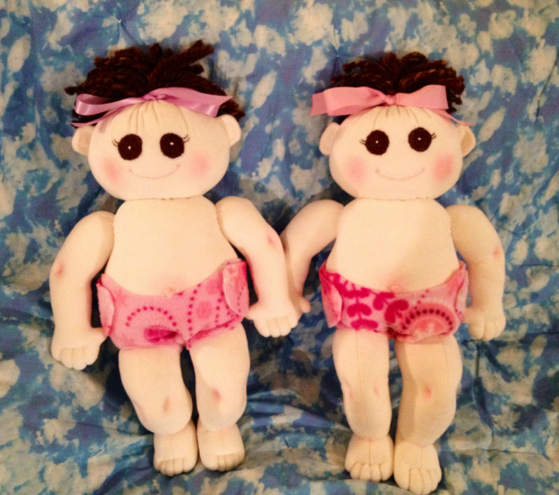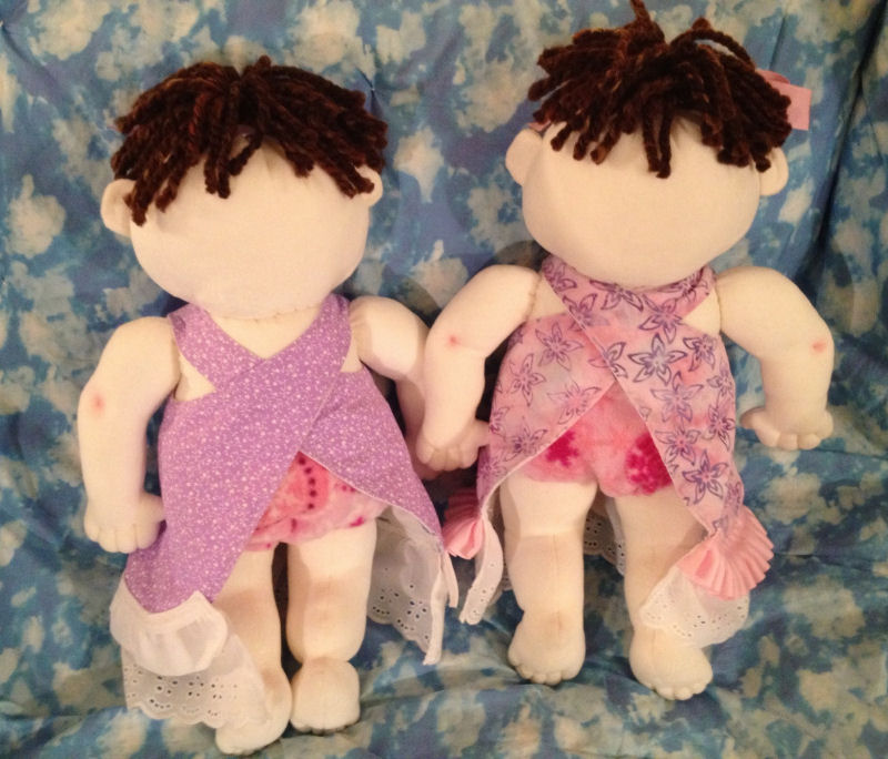 These twins are made from soft craft velour using the baby bows pattern by Judi Ward. The hair is made from super bulky wool blend yarn. Their eyes are wool felt and matching embroidery floss. The dress pattern is from the blue berry moon's Nakey Baby Series. The dresses are cotton fabric lined with flannel and the diapers are made from soft polar fleece. The dresses and diapers have Velcro closures for easy dressing and undressing for little hands.