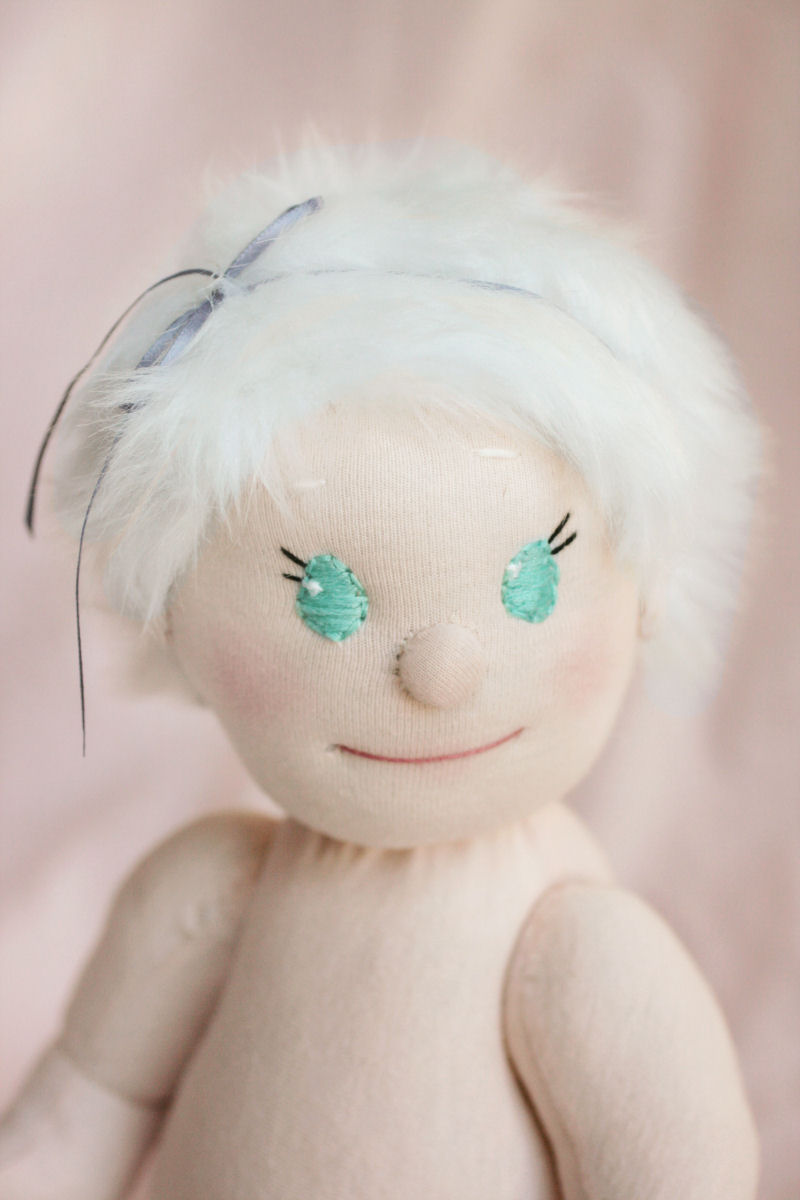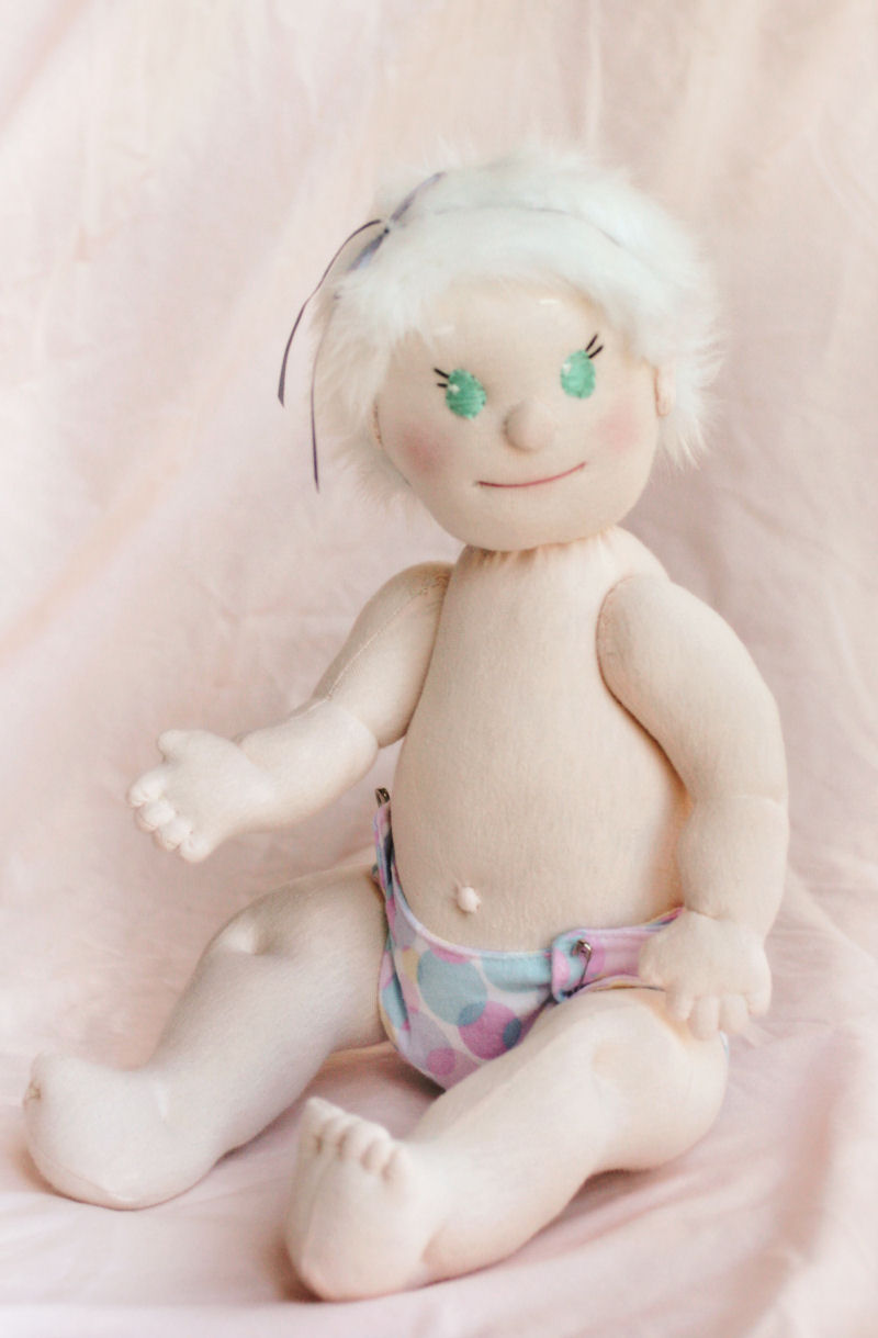 It is difficult finding the right fabric with the perfect amount of stretch, so Chloe was made from a t-shirt that I found while searching for fabric. Her arms and legs are button-jointed, and her hair is made from faux-fur fabric that can be brushed. Her diaper is made from scrap flannel-the colors seemed just right! Chloe's diaper can be worn with either the velcro tabs, or diaper pins.