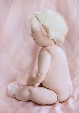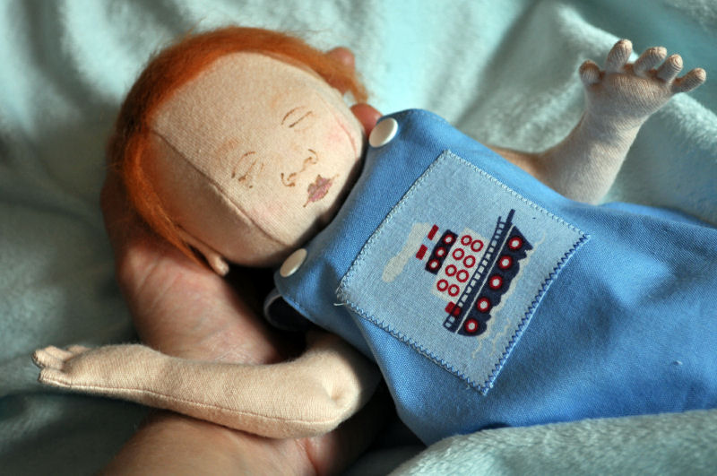 Declan is a 22w preemie, made from Sandy Eding's preemie pattern. He has a hand-painted face and is weighted with beads. Although it wasn't called for in the pattern, I decided to add hair made from merino wool roving, stitched into his scalp, which really made him come to life. Declan's arms and legs are jointed, but he is designed to be floppy so that he feels like a real preemie baby when held. He almost fits in the palm of my hand. His small size made him quite a challenge for my first doll making experience!