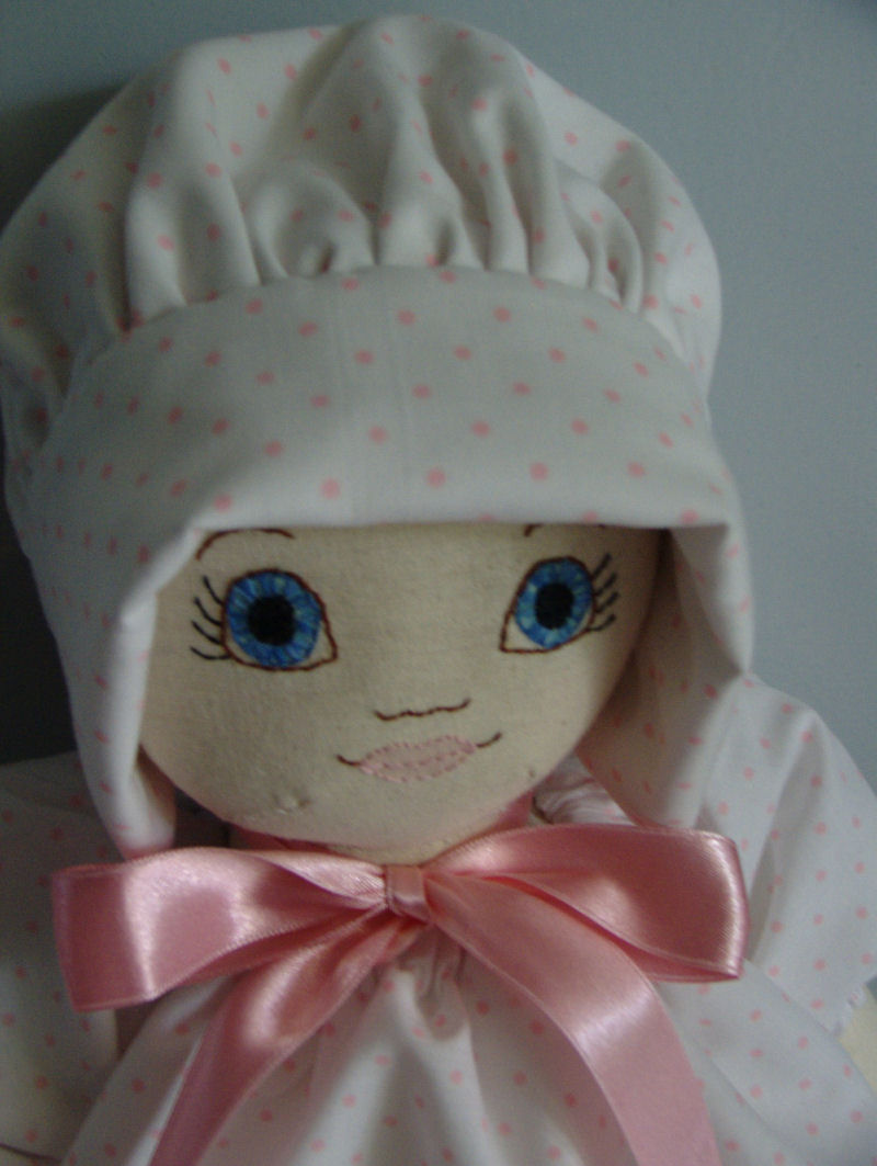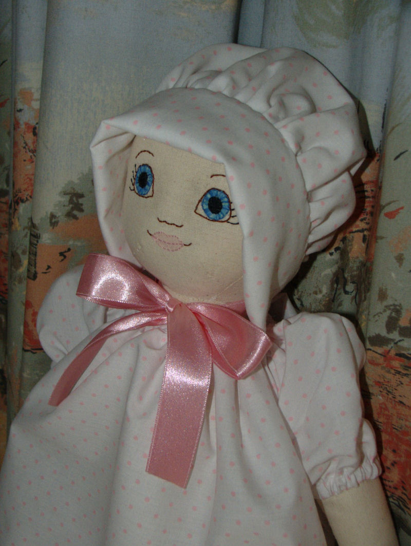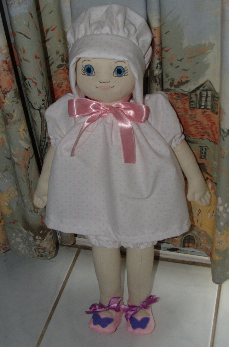 She is made from a pattern by Linda Carr. Her bloomers and bonnet are also by Linda Carr. I slightly changed her face to look more like a baby. I designed her shoes and shirt. She is made from calico. Her outfit is made from cotton fabric. Her shoes are made from felt.