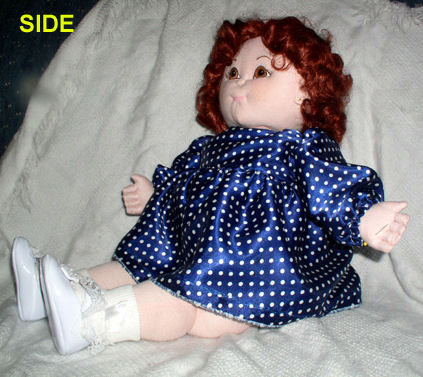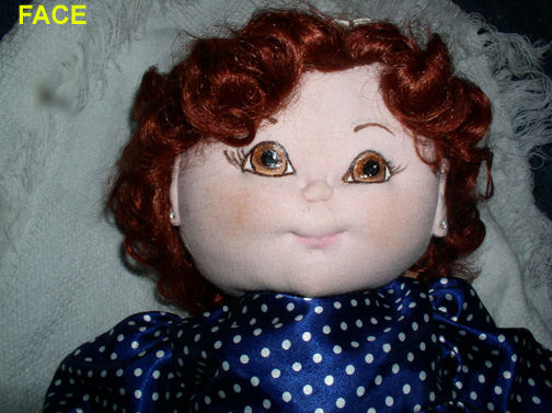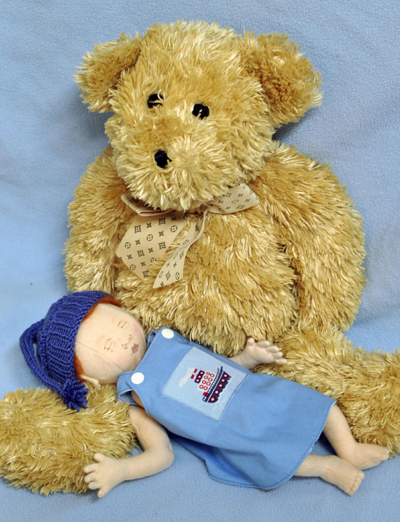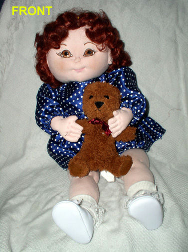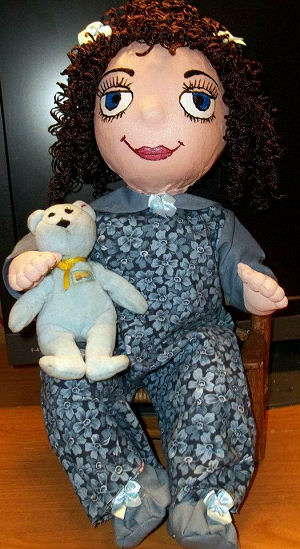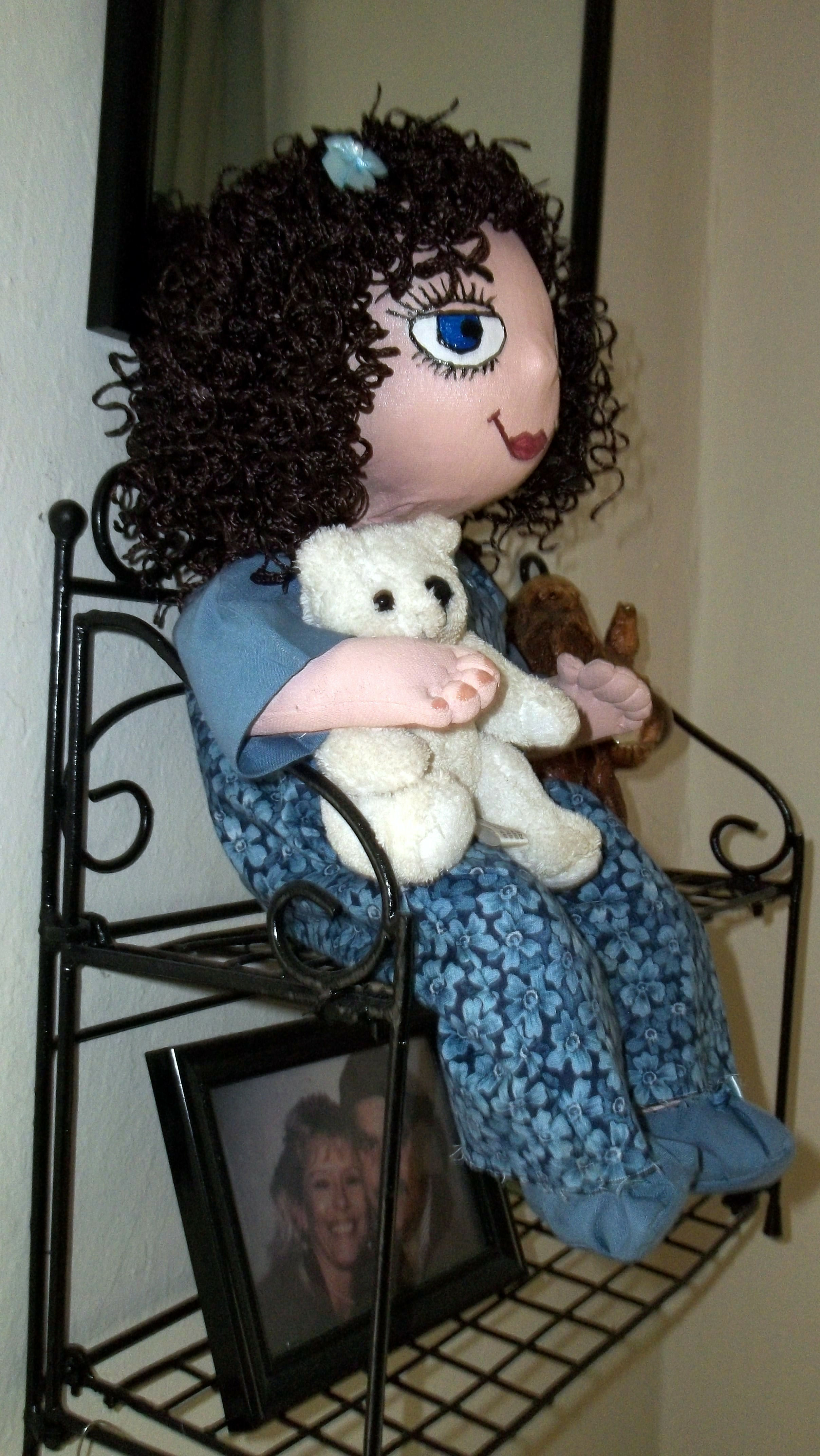This is Suzie. Why I don't know the name just came to me and I have been calling her Suzie ever since I've made her. I love dolls and have always made porcelain bodies so I thought I'd try and make me a cloth doll. She loves to play with Captain's (my small curly haired dog) teddy bear which Captain then loves to take and play with too—they have a lot of fun playing together but I have to keep a cloose eye on Captain to play easy. Suzie is only the second cloth baby doll of mine and I love her. The first is a boy doll name Tony and he is cute also and of course I love him too.