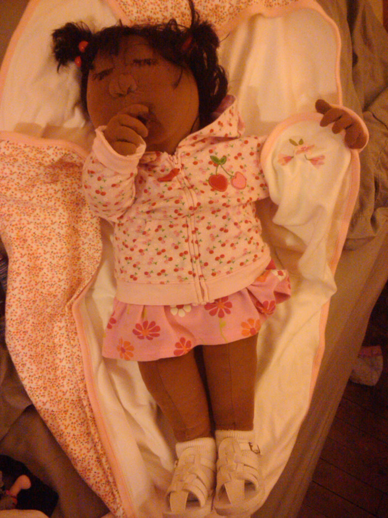 Genisis is 6 months old her clothing is purchased size 3-6 months.Genisis also is a mostly green baby ,recycled that is her clothing came from the second-hand store as did her skin. Her hair is recycled from my son's senior rock-n-roll day. She is made using Runo's Baby Girl doll pattern. I altered a few things.