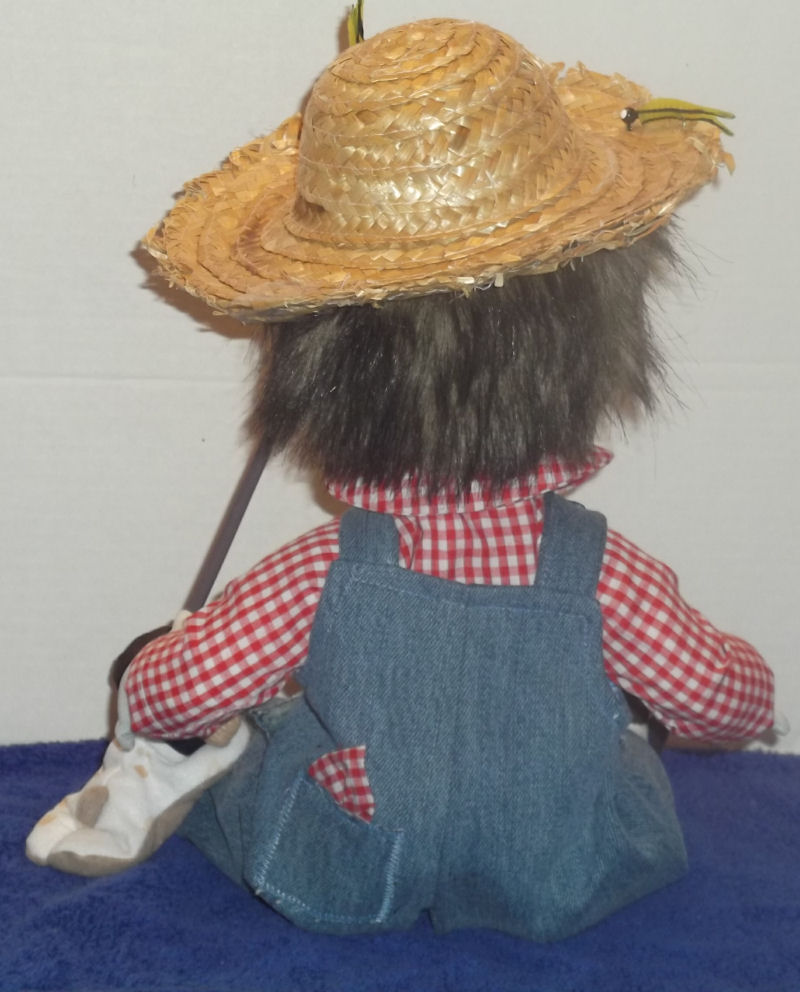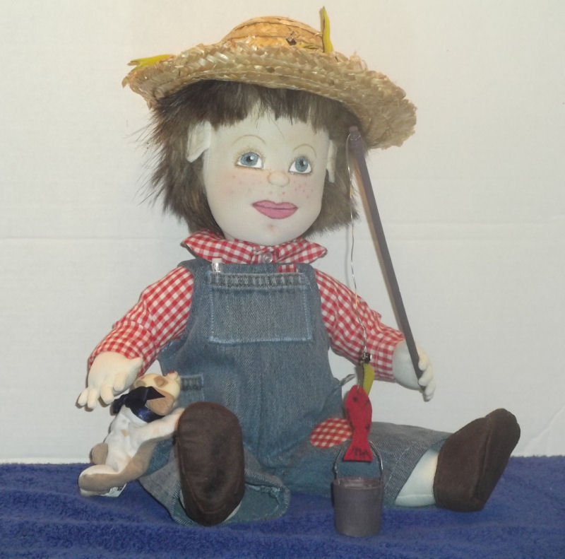 Joe bob loves sitting on the side of his fishing hole with his little pal Spot to watch the fish play in the water. His fishing pole was made from a dowel with wire for the line and a real lure that caught his little fish. Joe Bob's fishing hat is just how he likes it with the ragged edges and holes with all of his extra lures for good luck.