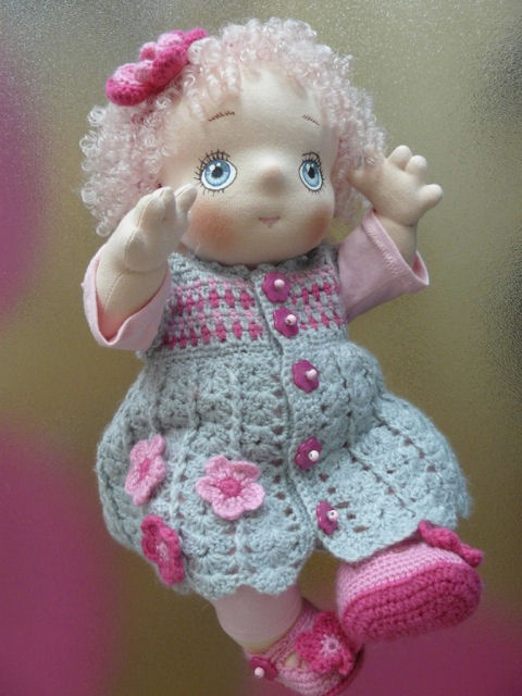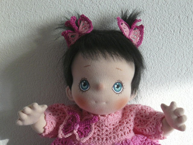 This is Harmke. She is a soft cloth doll and she is 38 cm (15 inch) tall. Her skin is made of tricot and her hair is made of faux fur . Her eyes are handpainted with fabric paint. Her hands, toes, elbows and knees are soft sculptured. Her limbs are jointed and she can sit by herself. She wears a crocheted dress, shoes and butterflies in her hair.