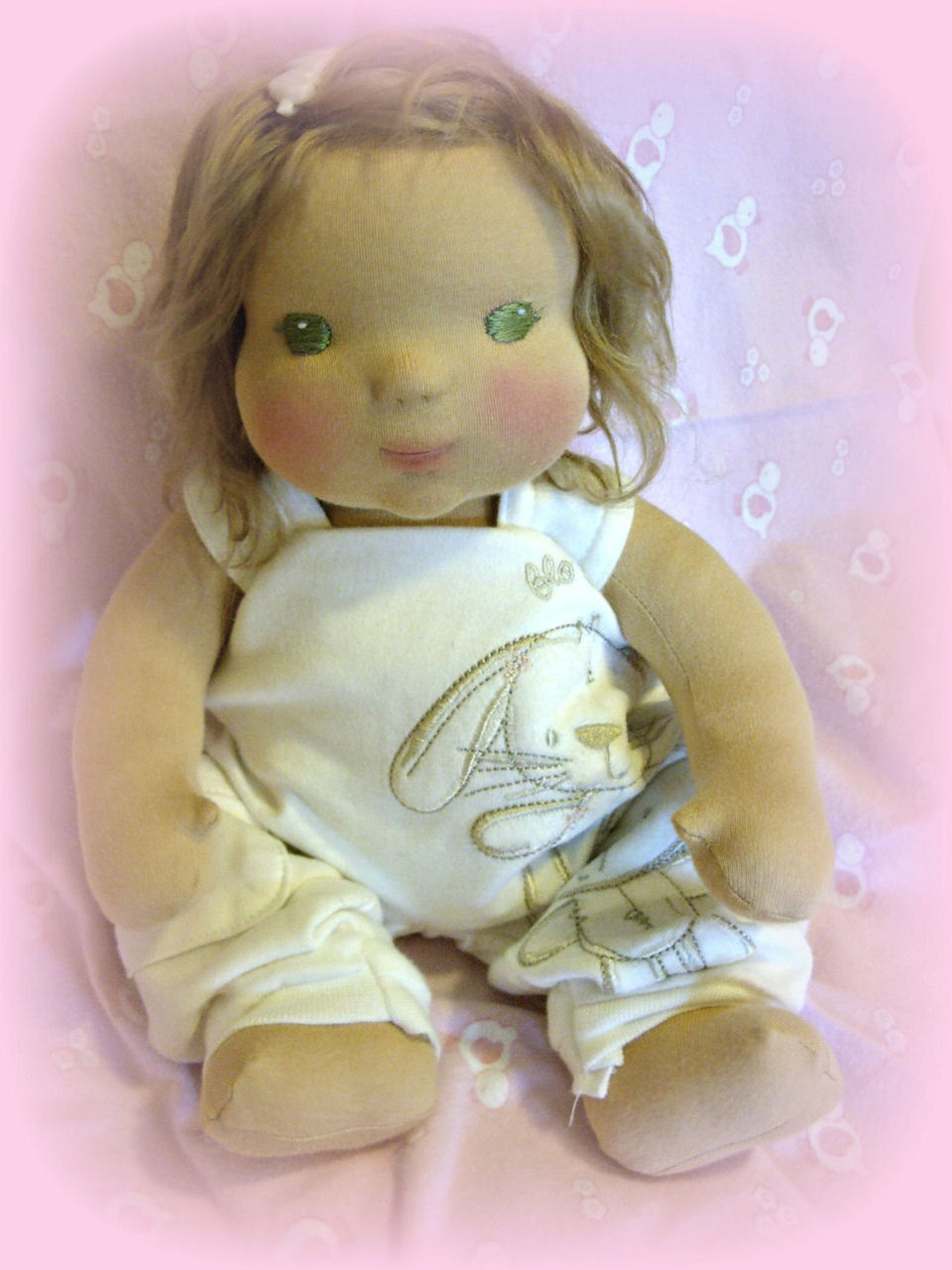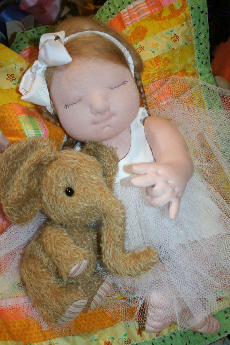 This is Sweet Serenity! She is 19 inches long. She is made of hand-dyed cotton interlock and she is my own pattern. Her head is made in the Waldorf tradition and then features are needle -felted. Her hair is mohair wefting. The outfit Serenity wears is my own design made by me. She has a little mohair Elephant made of mohair and also made by me but I cannot find the designer at this time.
