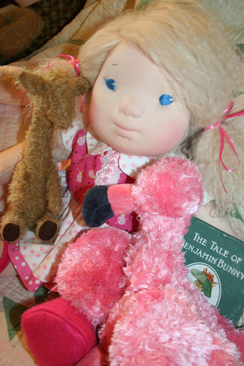 Miss Willow likes to find a nice quiet spot to sit and read with her friends, They often just look at the pictures while mommy reads to them. The color pink is Willow's favorite color. She is wearing her favorite pink shoes. She often takes her little shoes off while listening to stories!